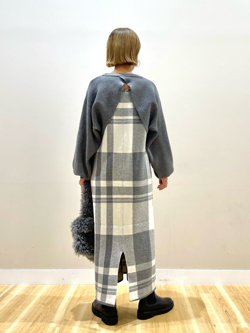 大きめチェックが印象的なワンピースと
