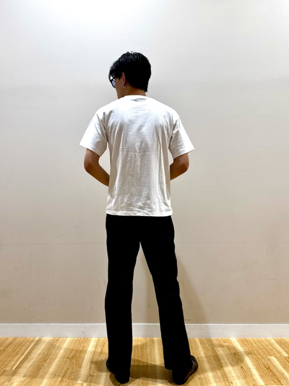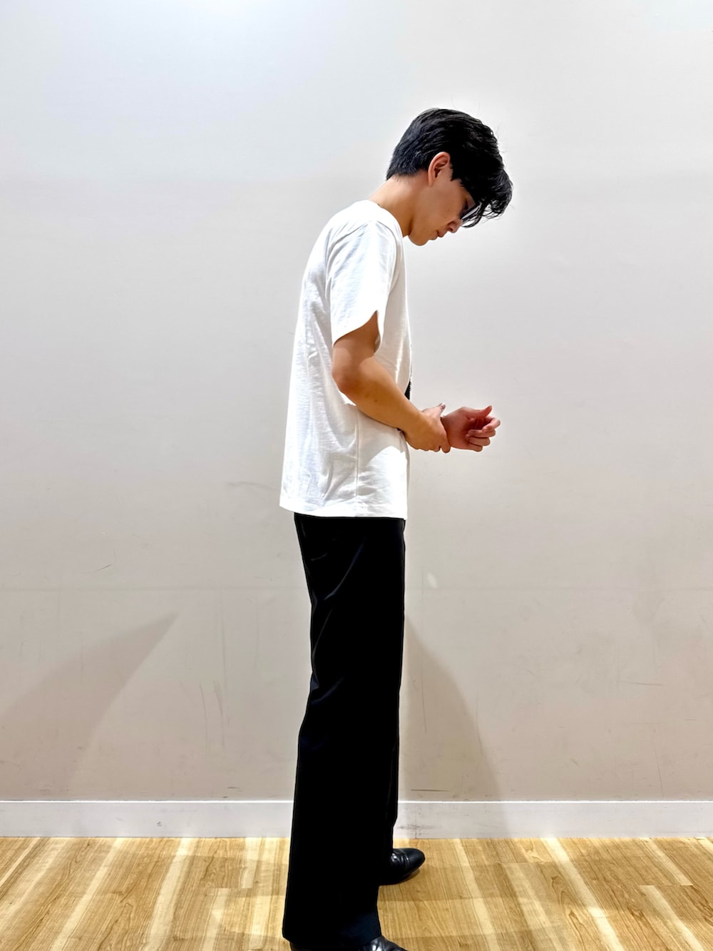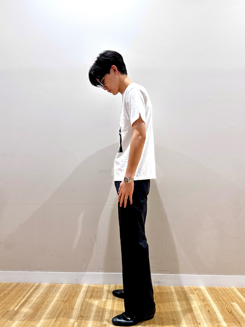 ソニックユースのバンドTにセンタープレスのスラックスを合わせることで、ラフさの中に品が出ます。靴はシャープなレザーシューズ合わせるとシルエットが縦に流れるのでスマートな印象が出ます。結構ミニマルな感じですが、Tシャツの存在感がデカく、ロックのエッセンスも出ます。