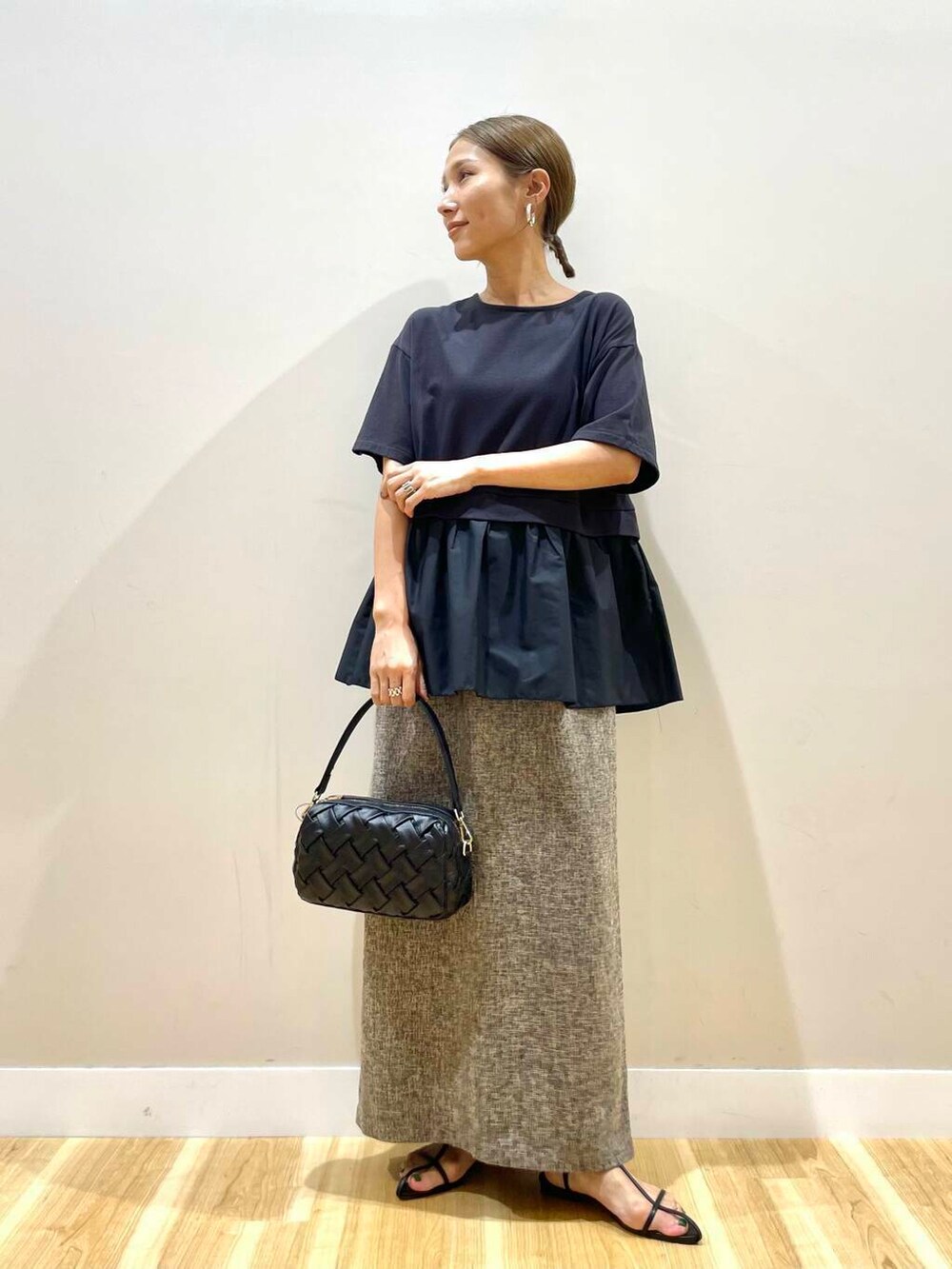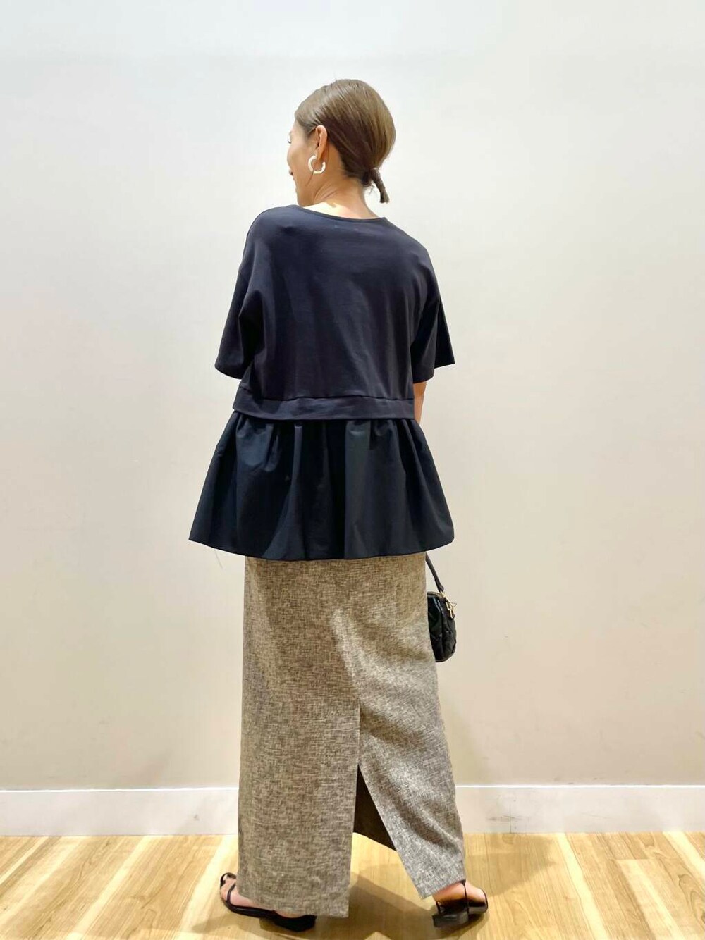 ペンシルスカートはしっかり丈感あるので高身長さんにも。ツイード風の素材で重たくなく、