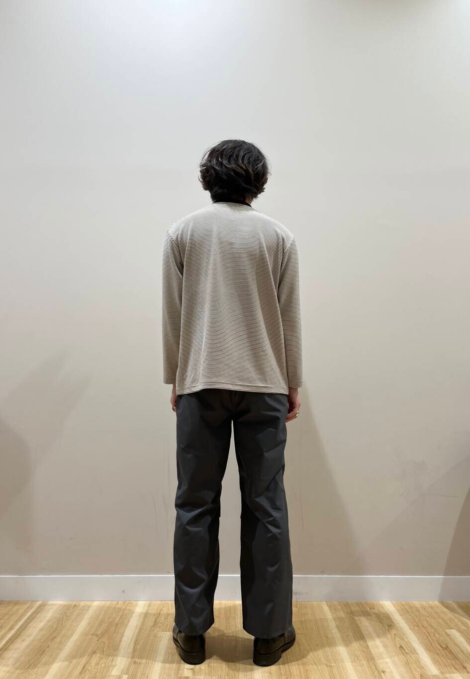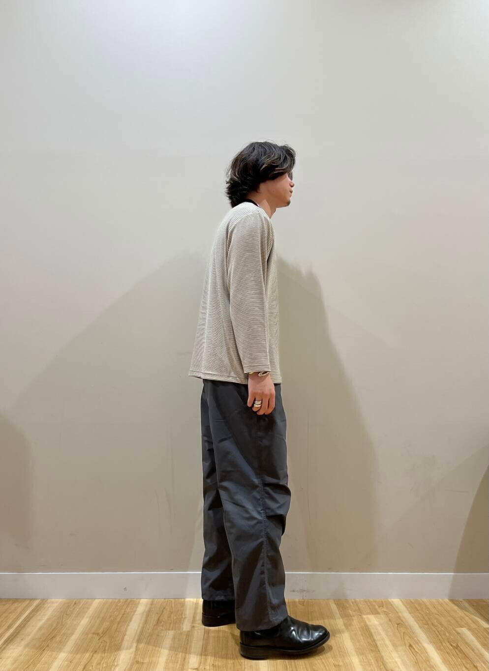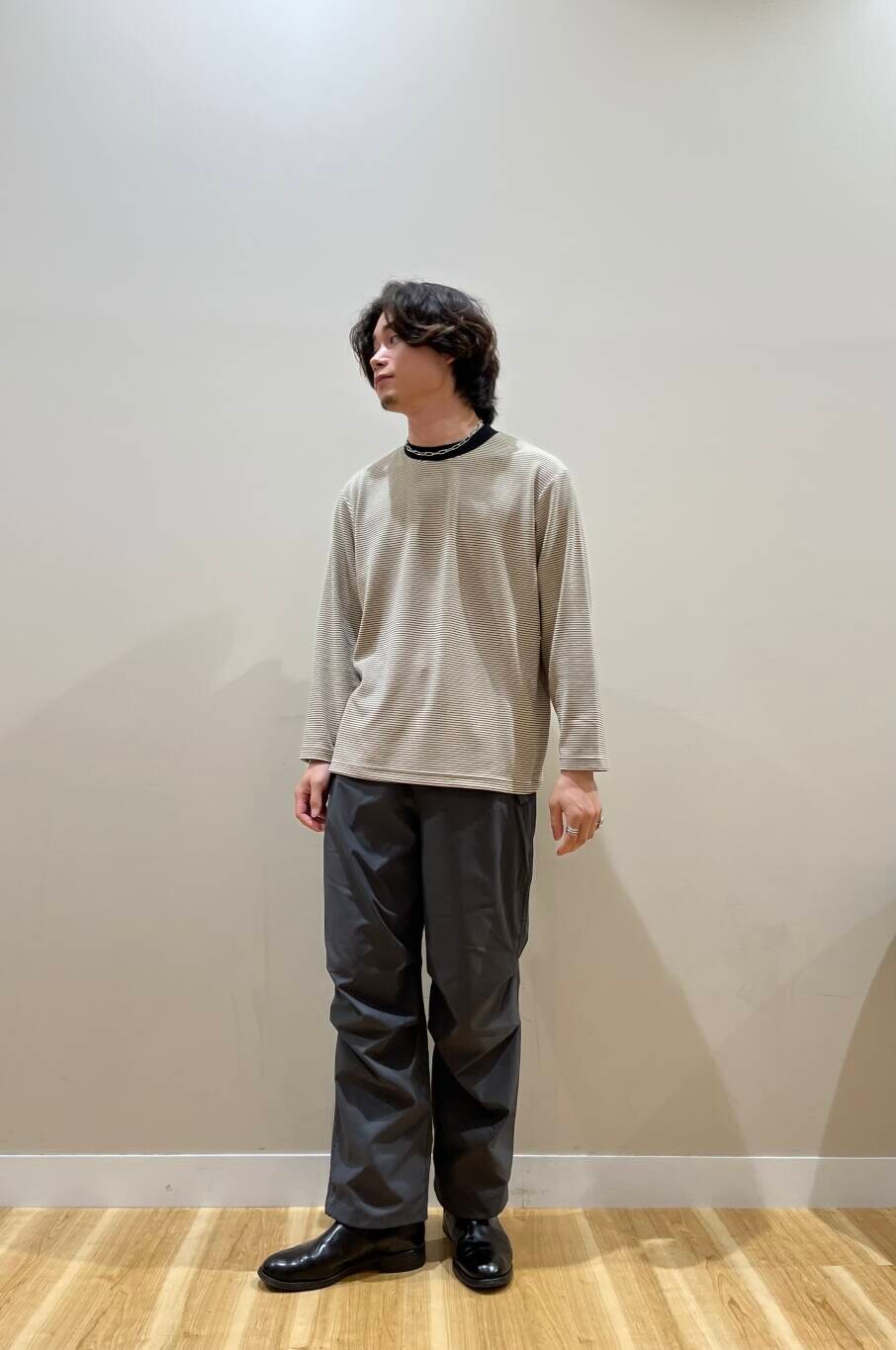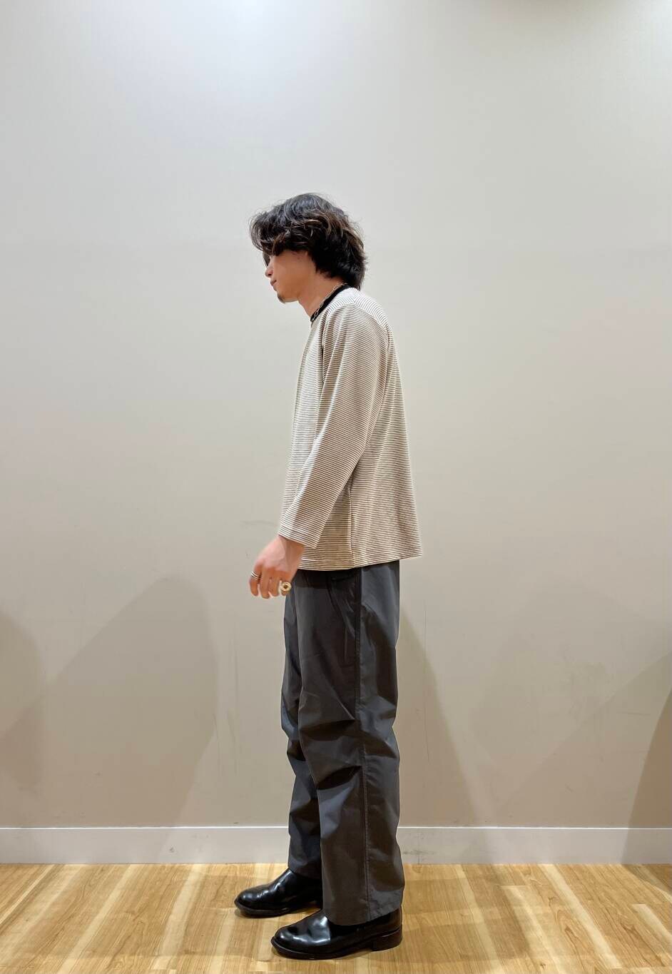 パンツはナイロンのパラシュートパンツ、膝下のつまみが立体的に見えて、セレクトにありそうな感んじで高見えしそうです。