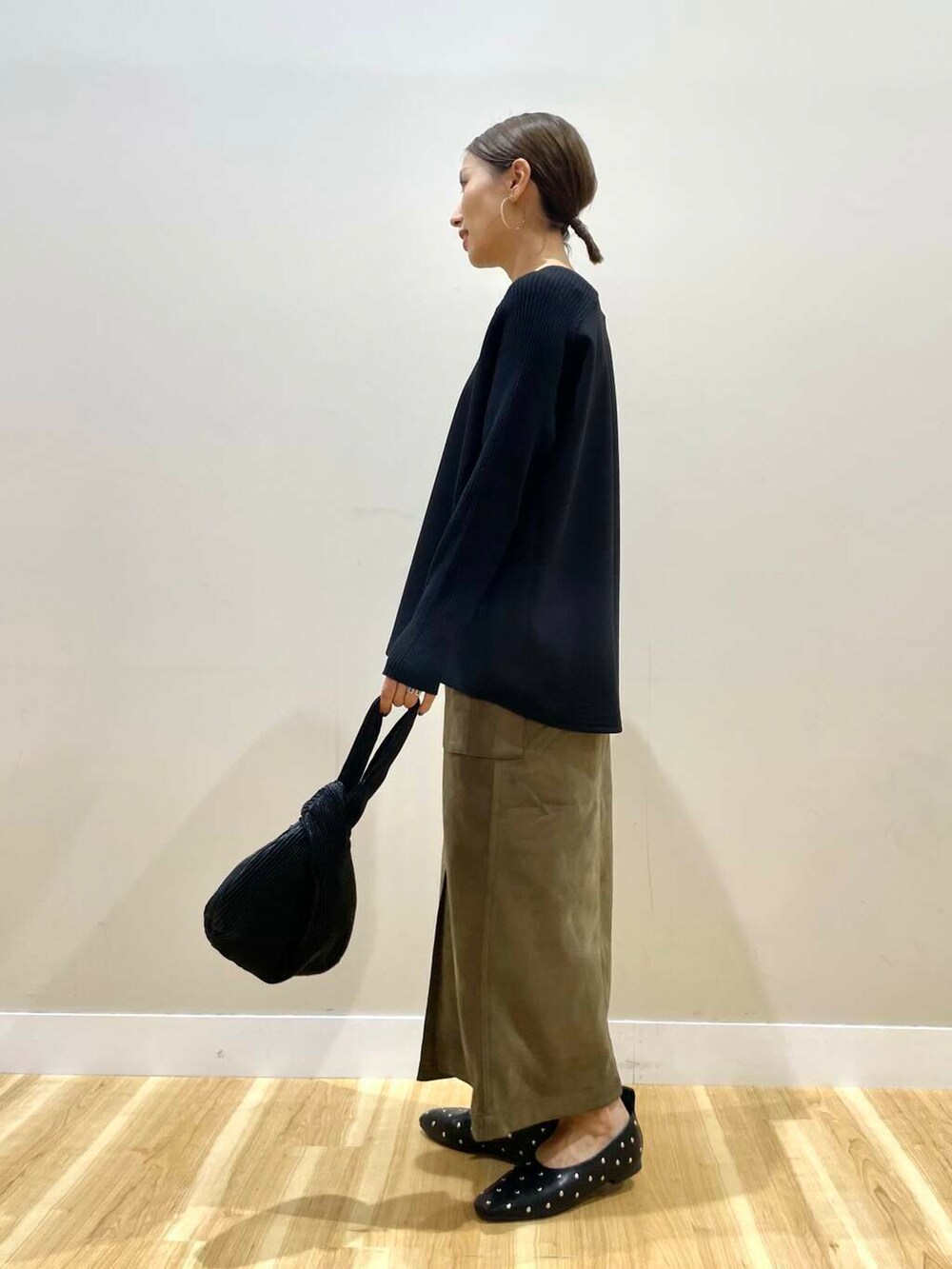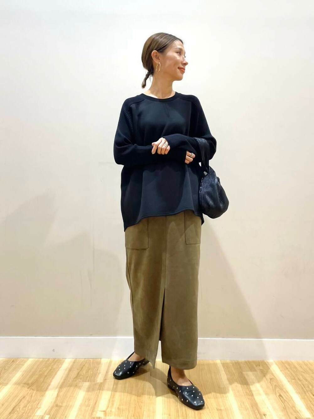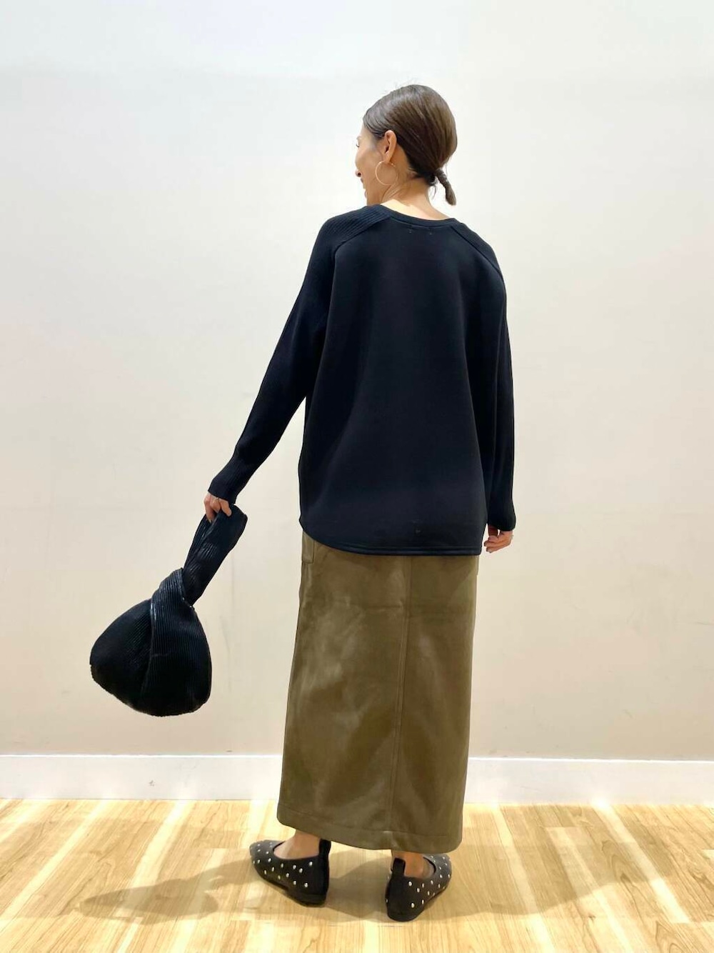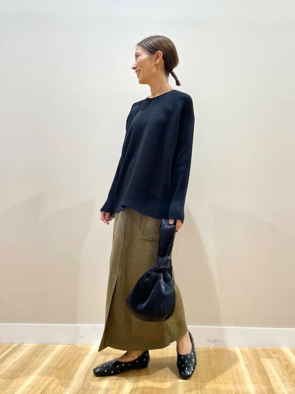 ニットは肩から腕に入ったリブが細見えしてくれ、
