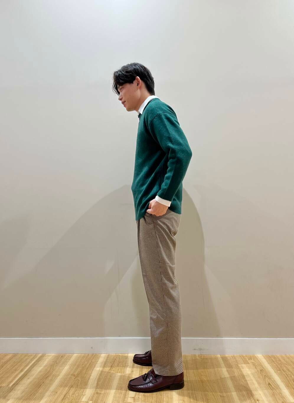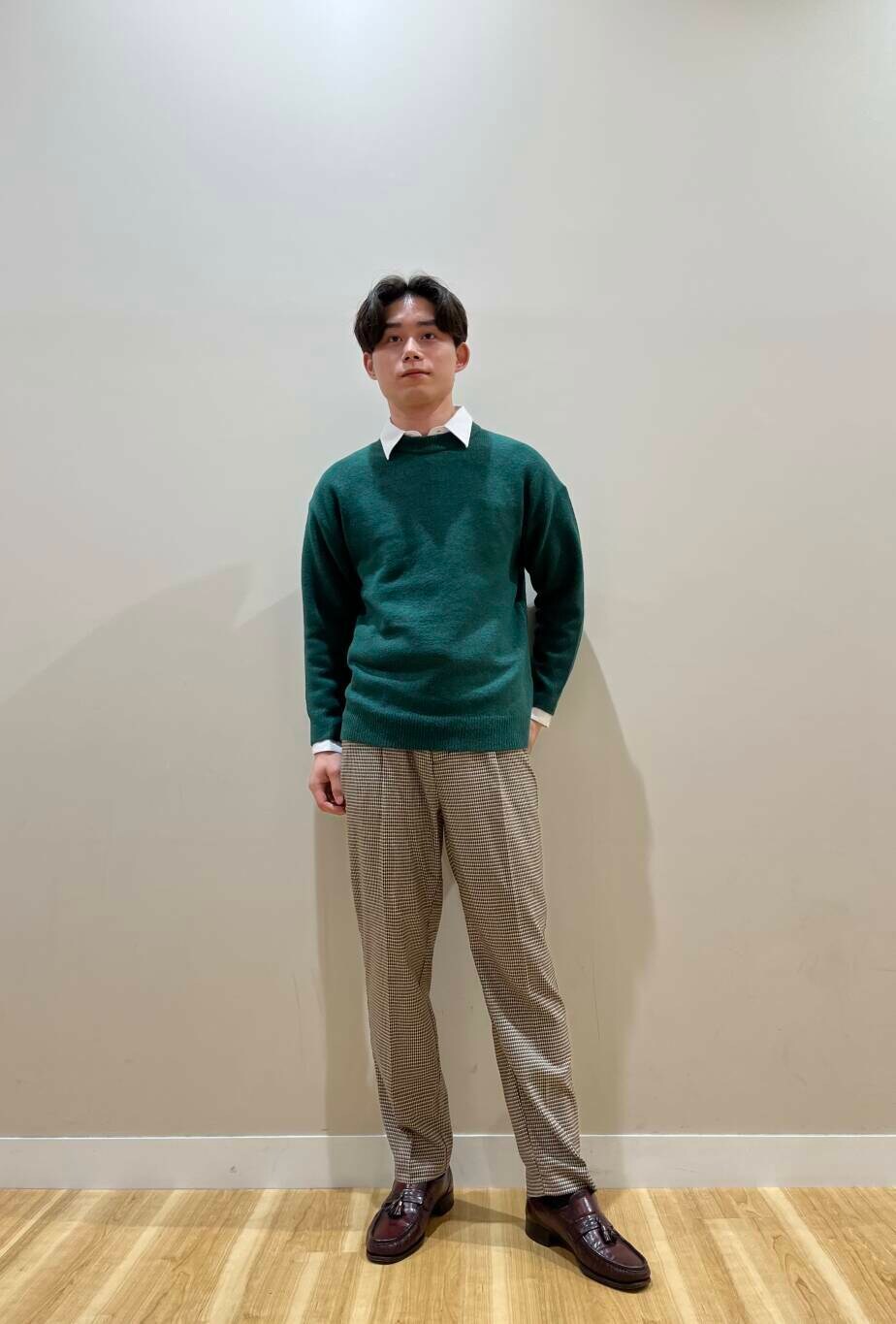 トップスは明るいトーンで若々しく、パンツやシューズでシックな感じを演出。