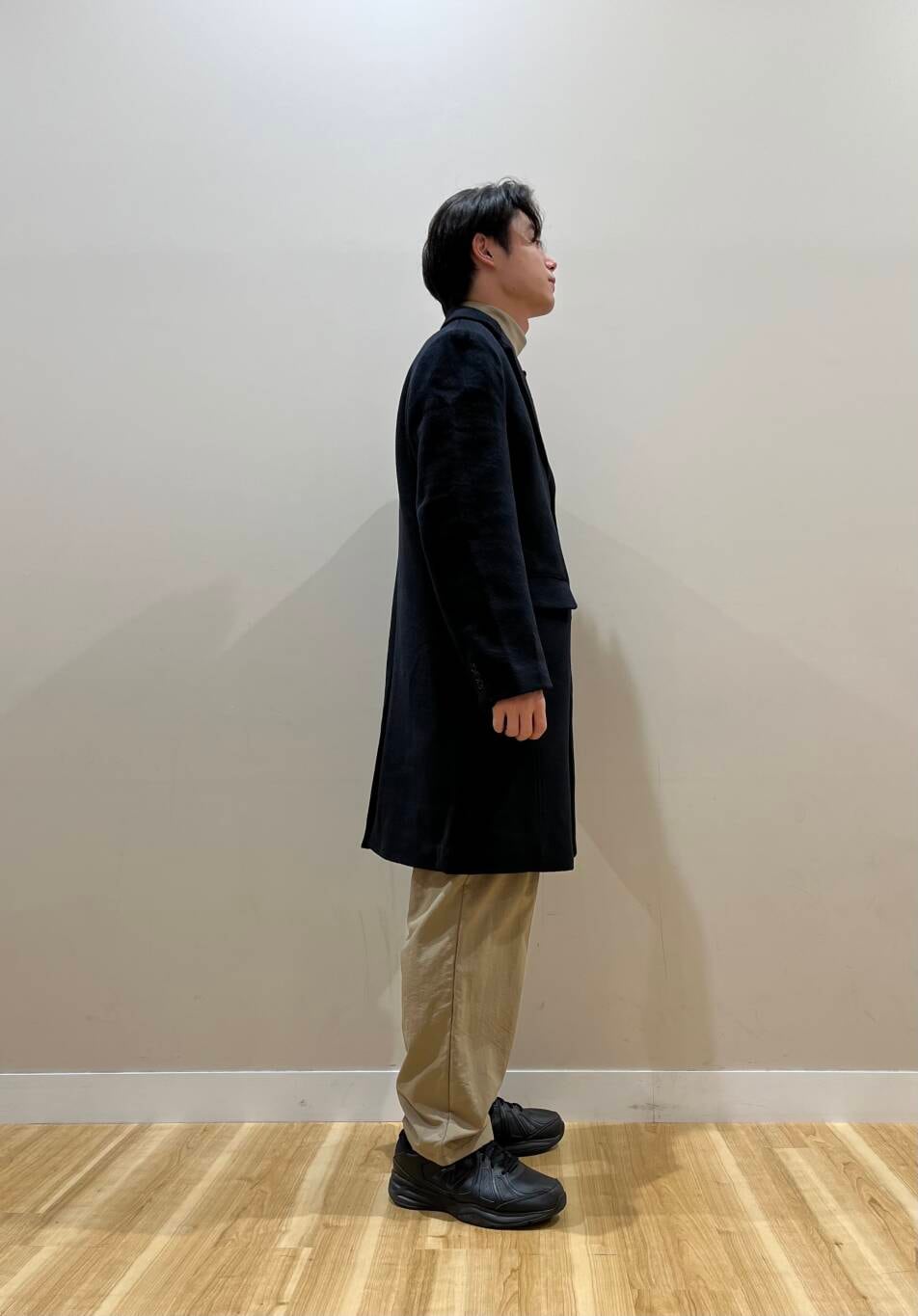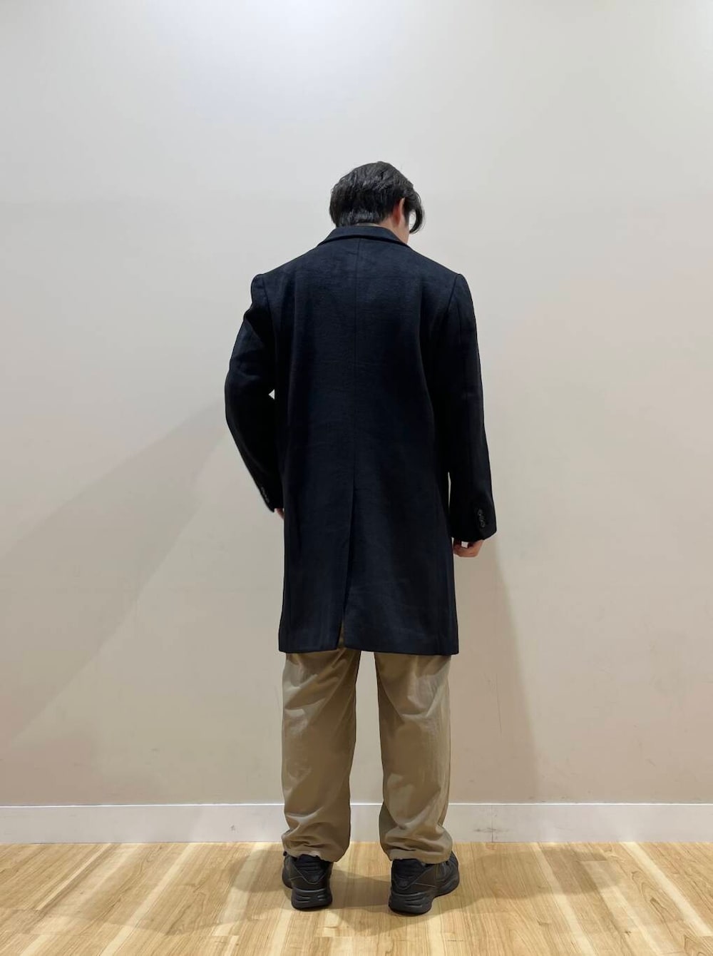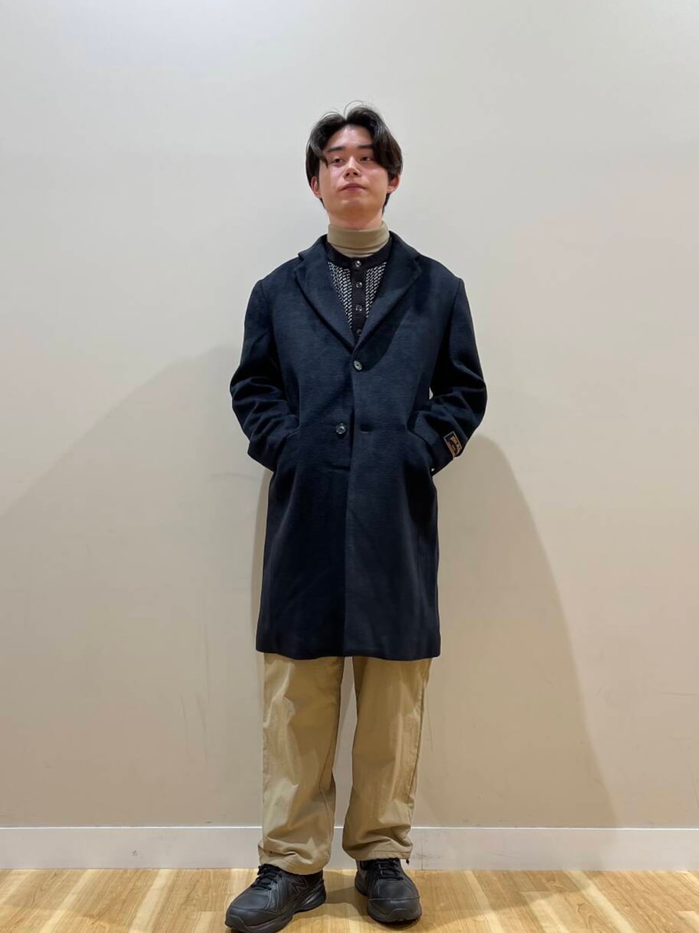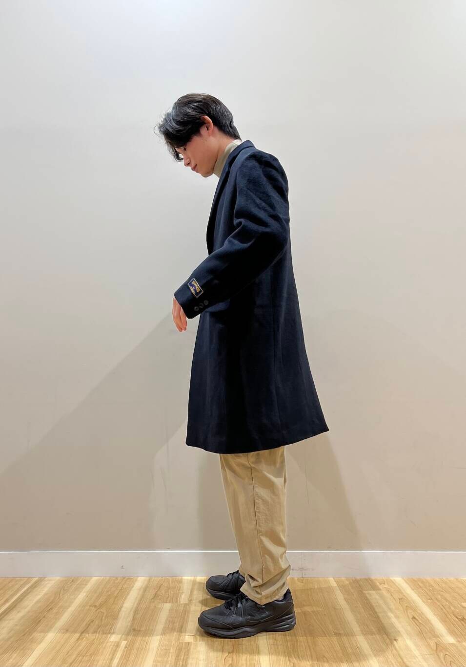 てことでカジュアルにスタイリング、首元にレイヤードを少し入れながら、パンツの少したまる感じと少し分厚めのスニーカーで目線を分散、