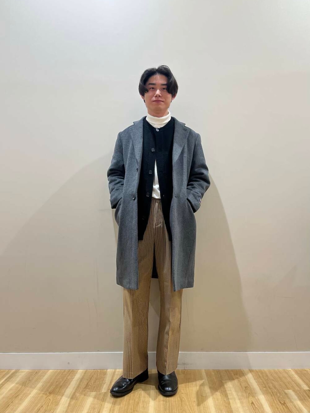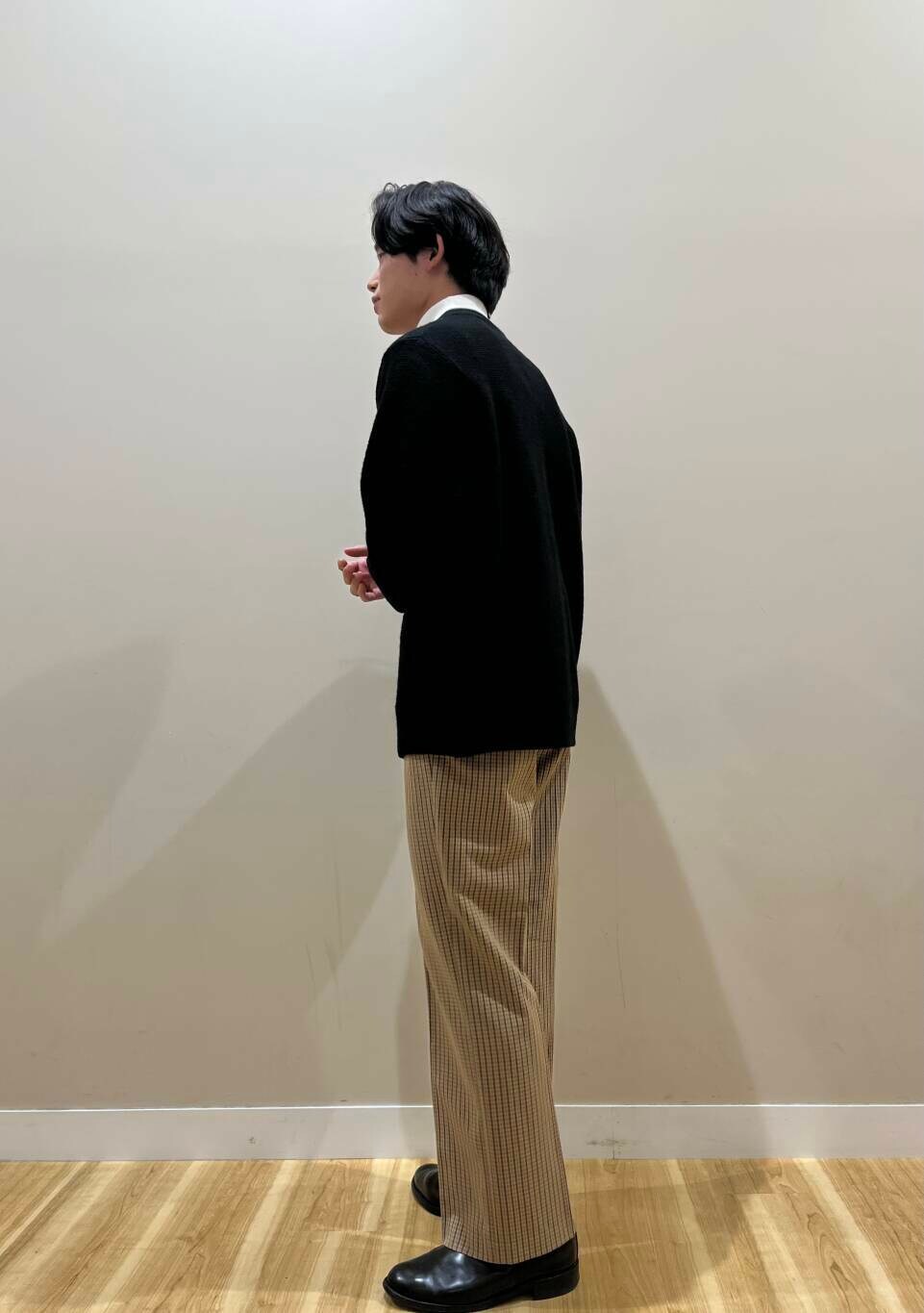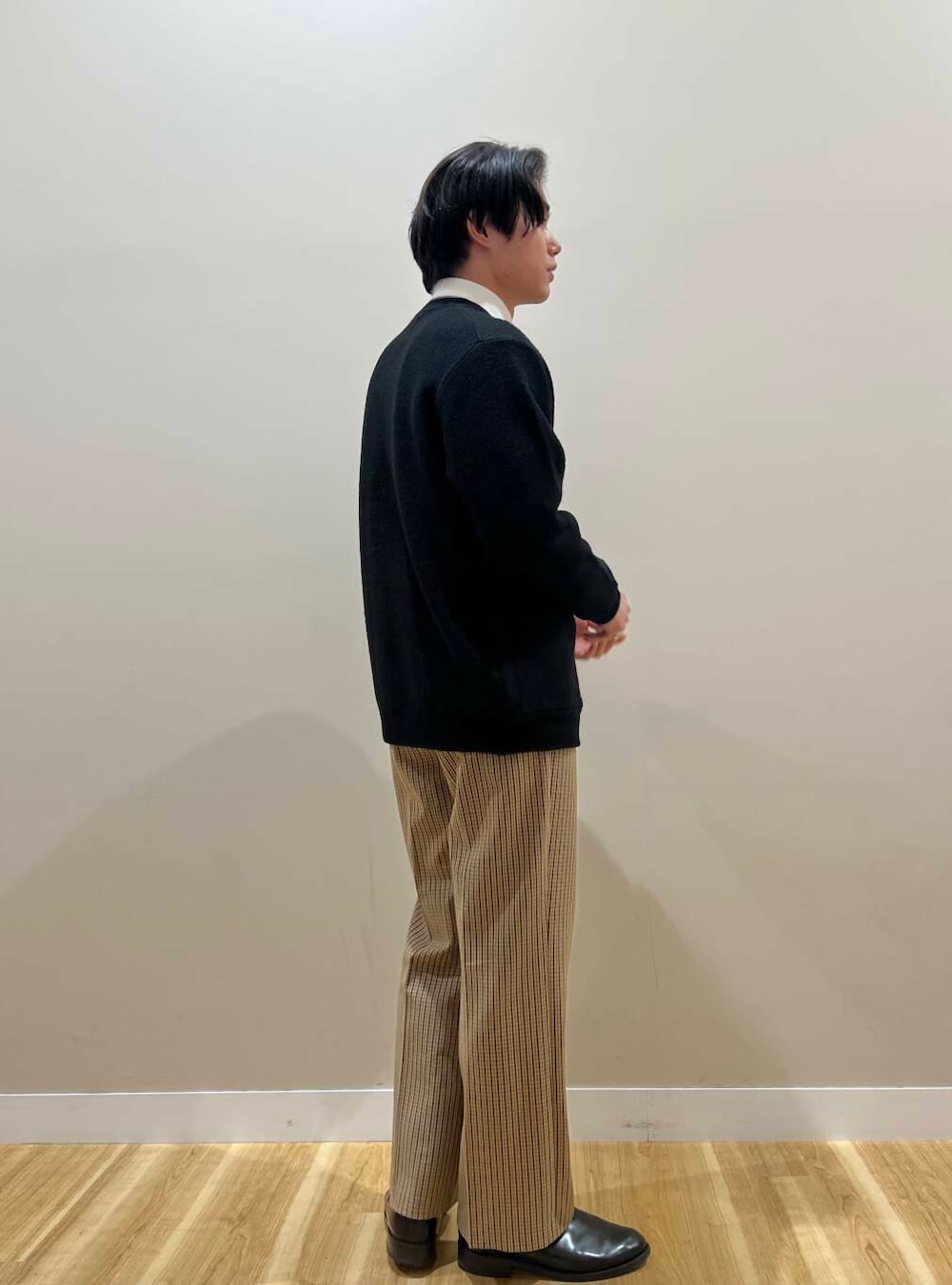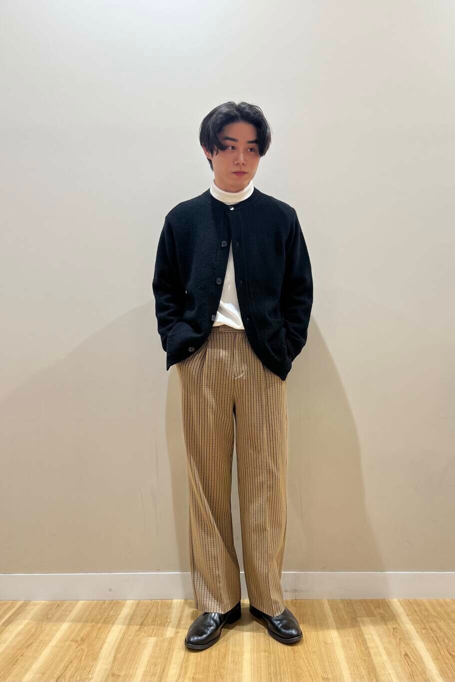 首元のレイヤードで遊び、ボタンをトップだけ止めカジュアル感を作り、パンツは差し色でチェックを採用。