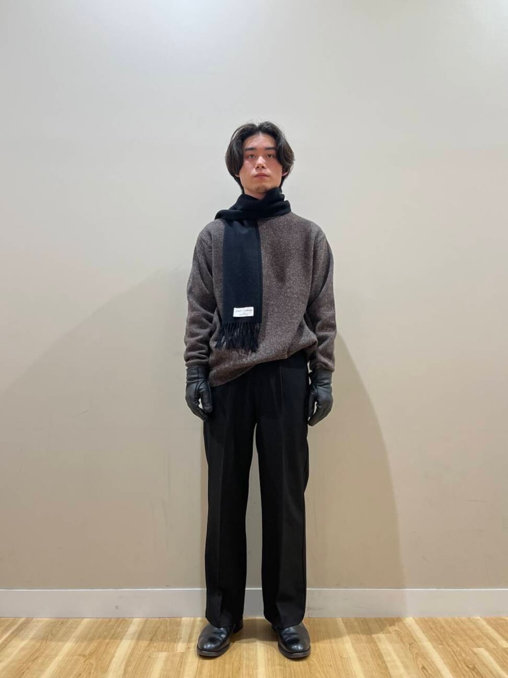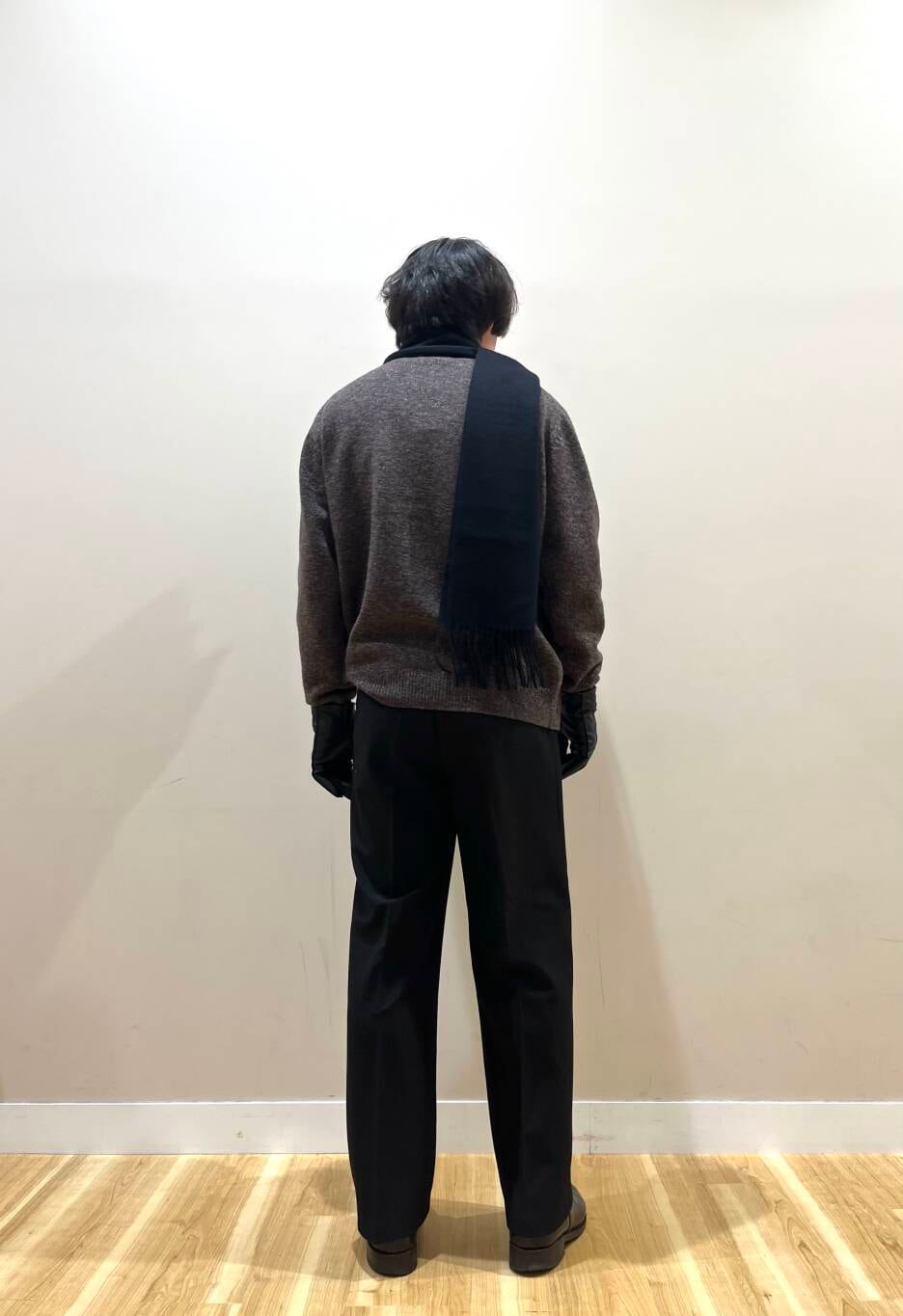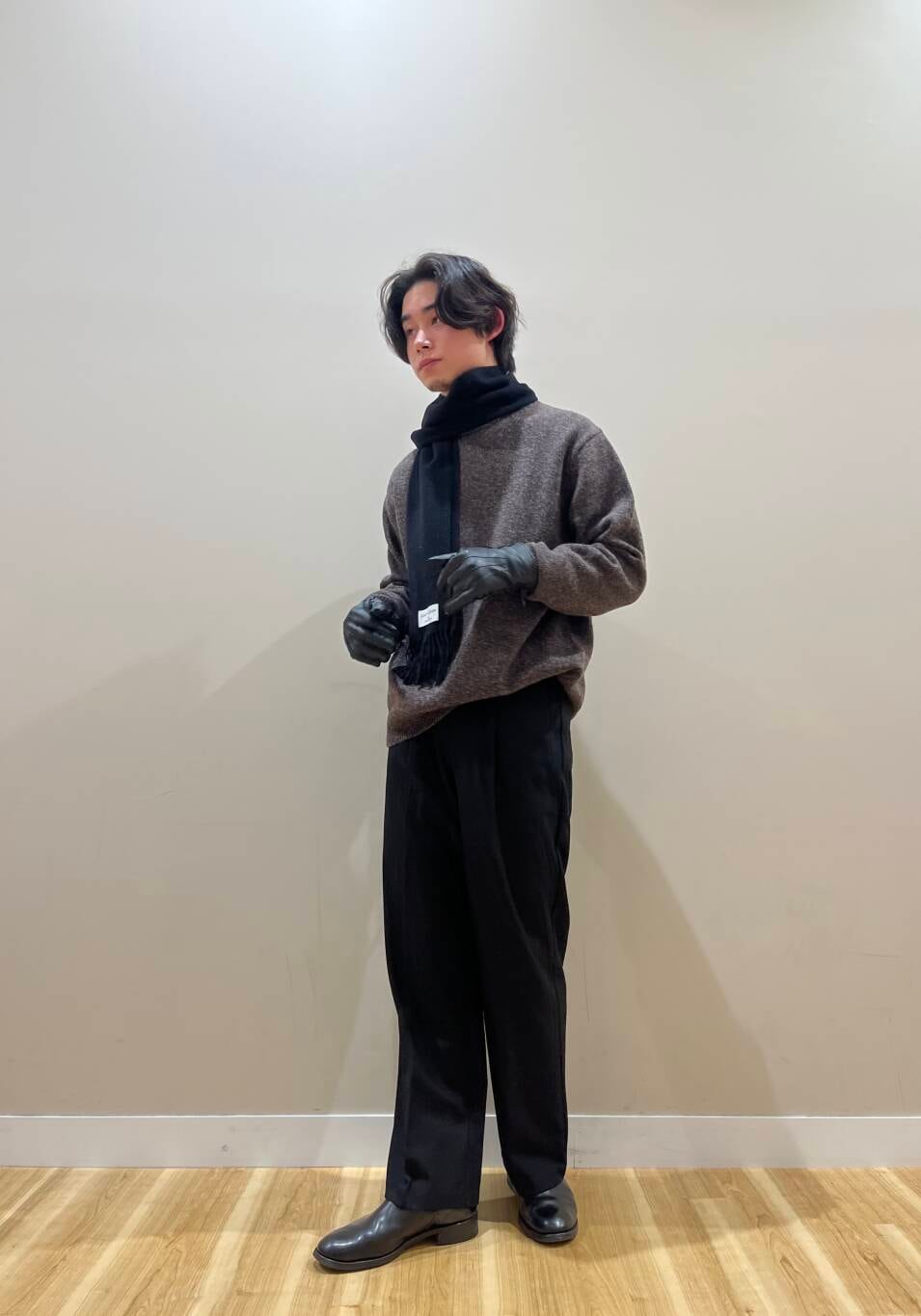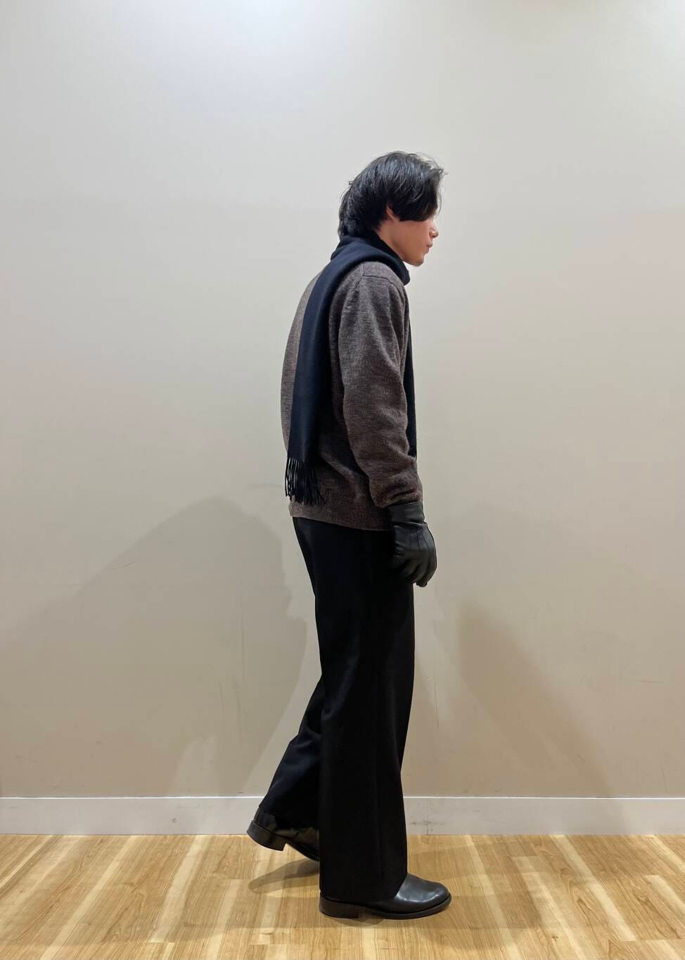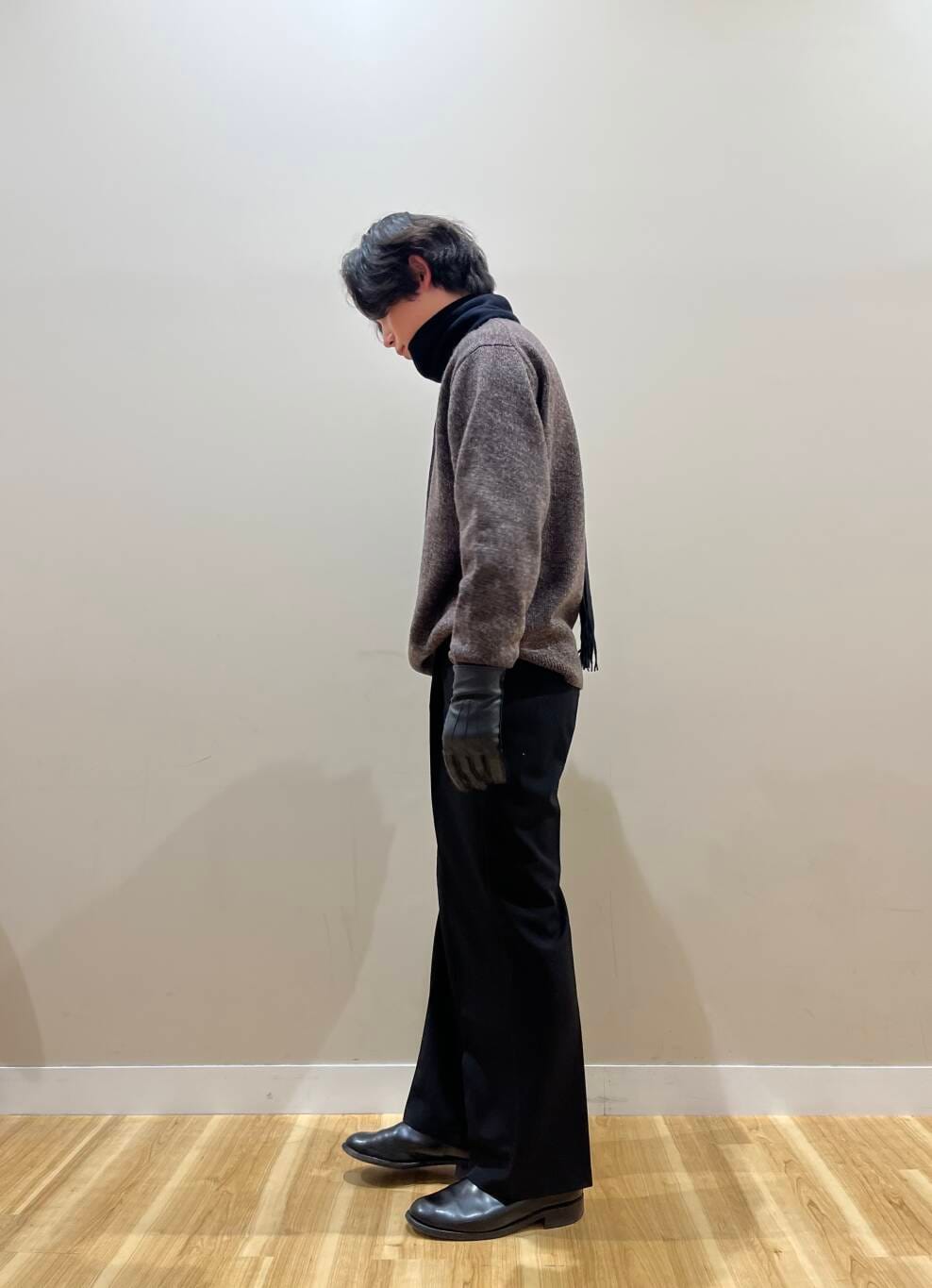 ニットはネック周りがモックネックに近く、メランジの聞いた肉厚のニットです。