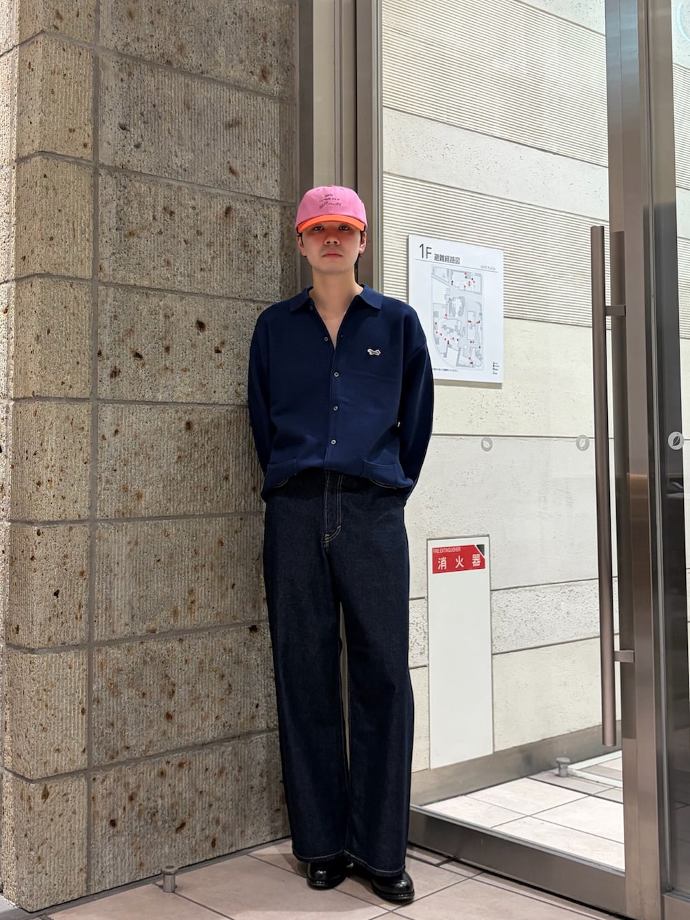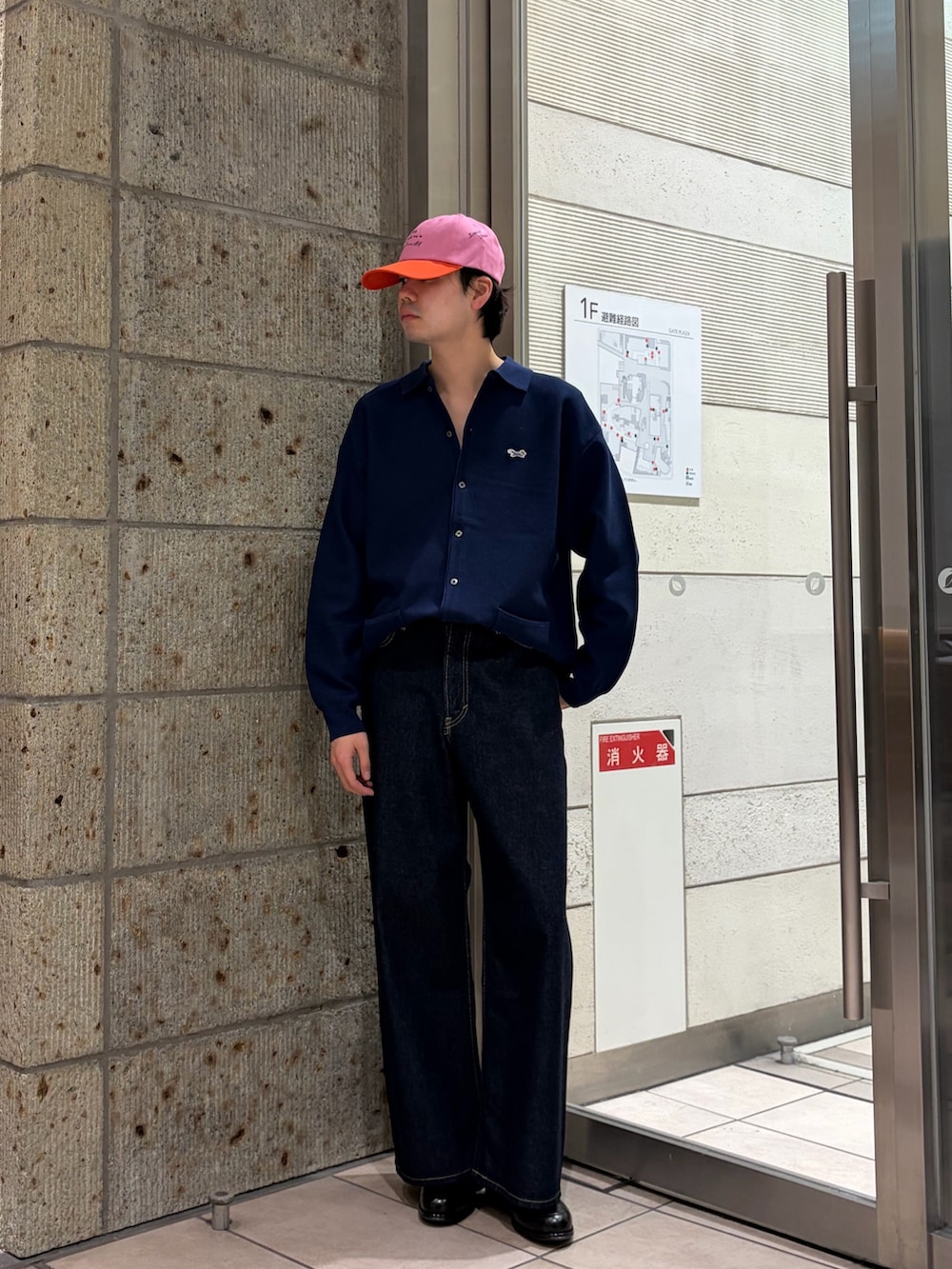 上下落ち着いた色味にはキャップくらい派手目で