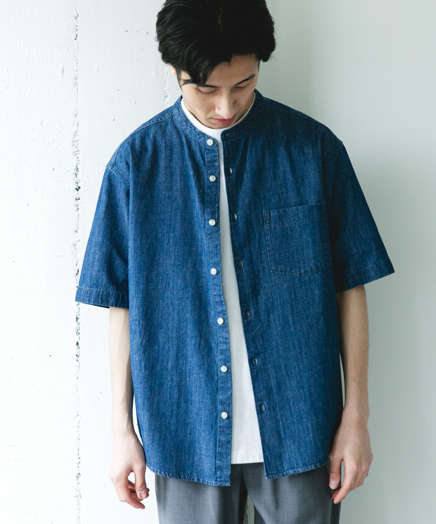 定番のバンドカラーデニムシャツをリネンを加えより夏らしく、軽やかに、快適になりました
