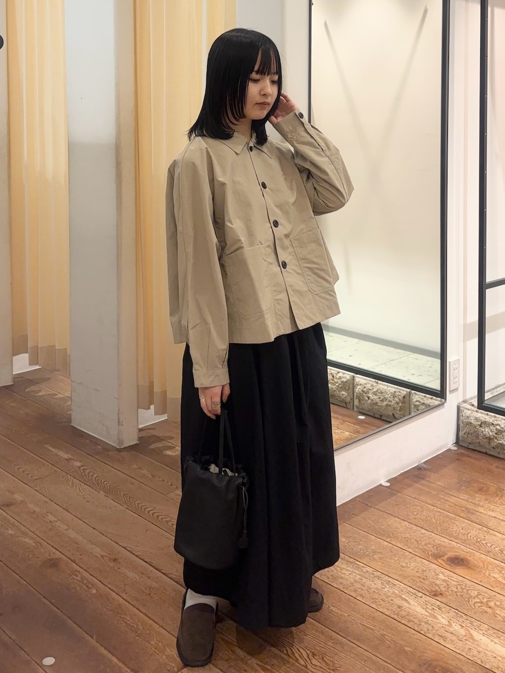 ダントンのシャツはショート丈になっているので、今回のようにボトムスにボリュームを持ってくるとバランスが良いです✴︎肌寒い時期にはシアーのタートルやブラウスを重ねたり、ボタンを外して軽い羽織にしたりと、長いシーズン着用していただけます◎