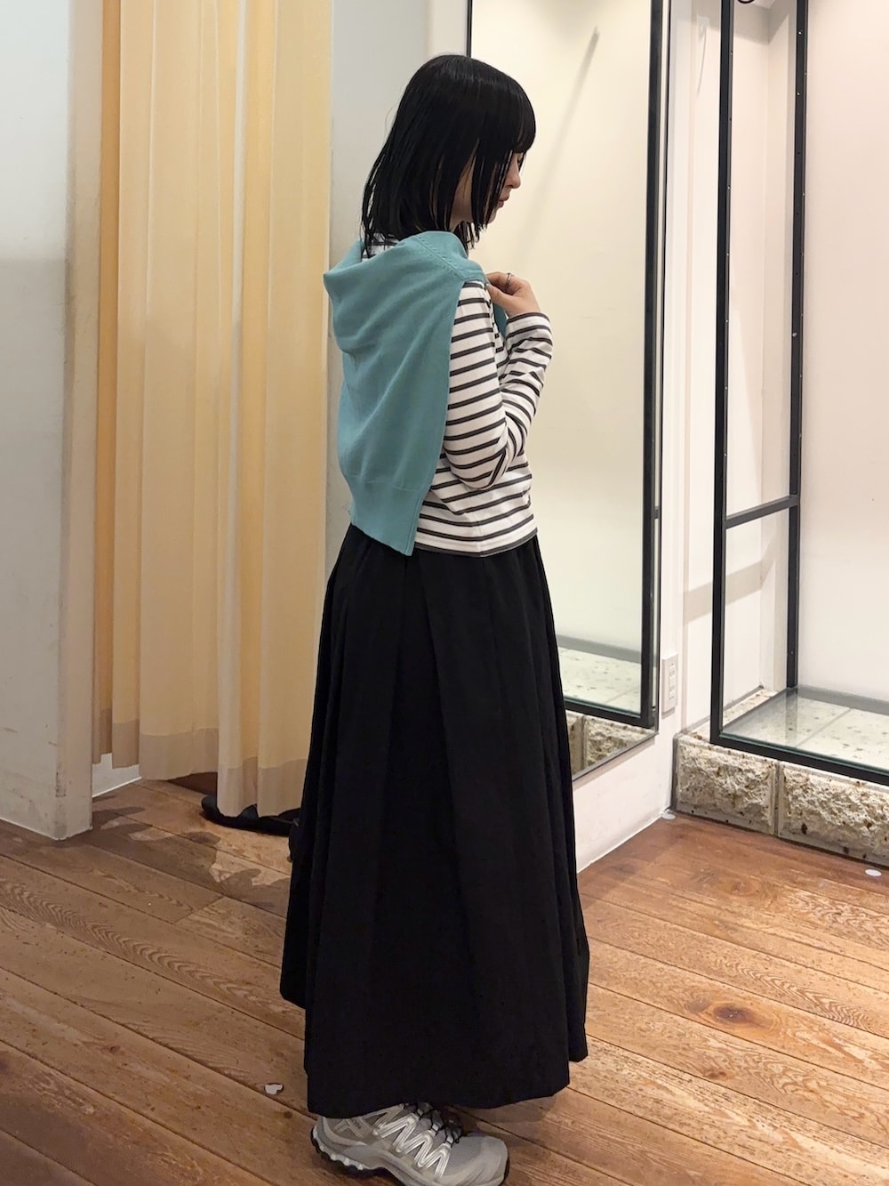 かぐれのスカートは、遠州染という染め方をしているので生地に程よいシワ感とムラ感があり、普通のスカートよりも上品で様になります!ウエストはゴムで履き心地も良いです🙆🏻