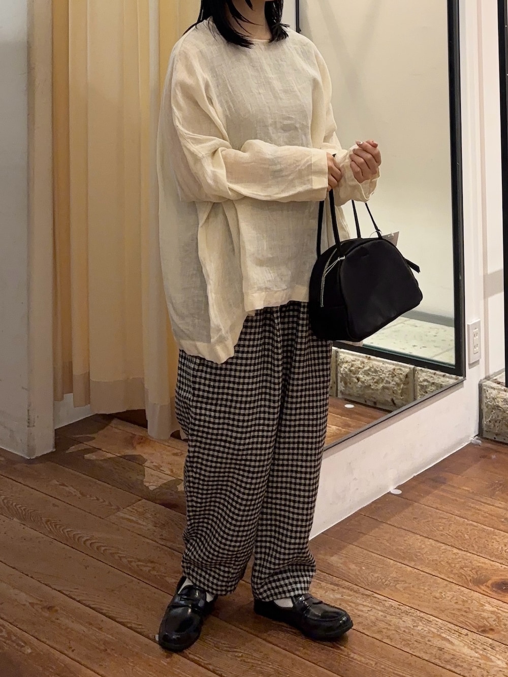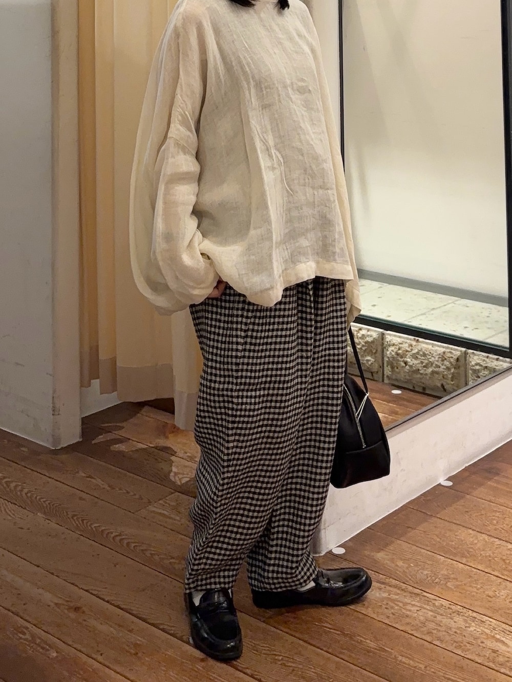 春から夏にかけて着用していただけるパンツです🩳 バランスが取りやすいクロップド丈のイージーパンツで、シンプルなトップスと相性が良いギンガムチェックです✨ウエストのタックが立体感出してくれます◎裾にダーツが入っていて、さり気ないこだわりが詰まったデザインです!リネンにシルクがブレンドされた生地を使用しています🌿