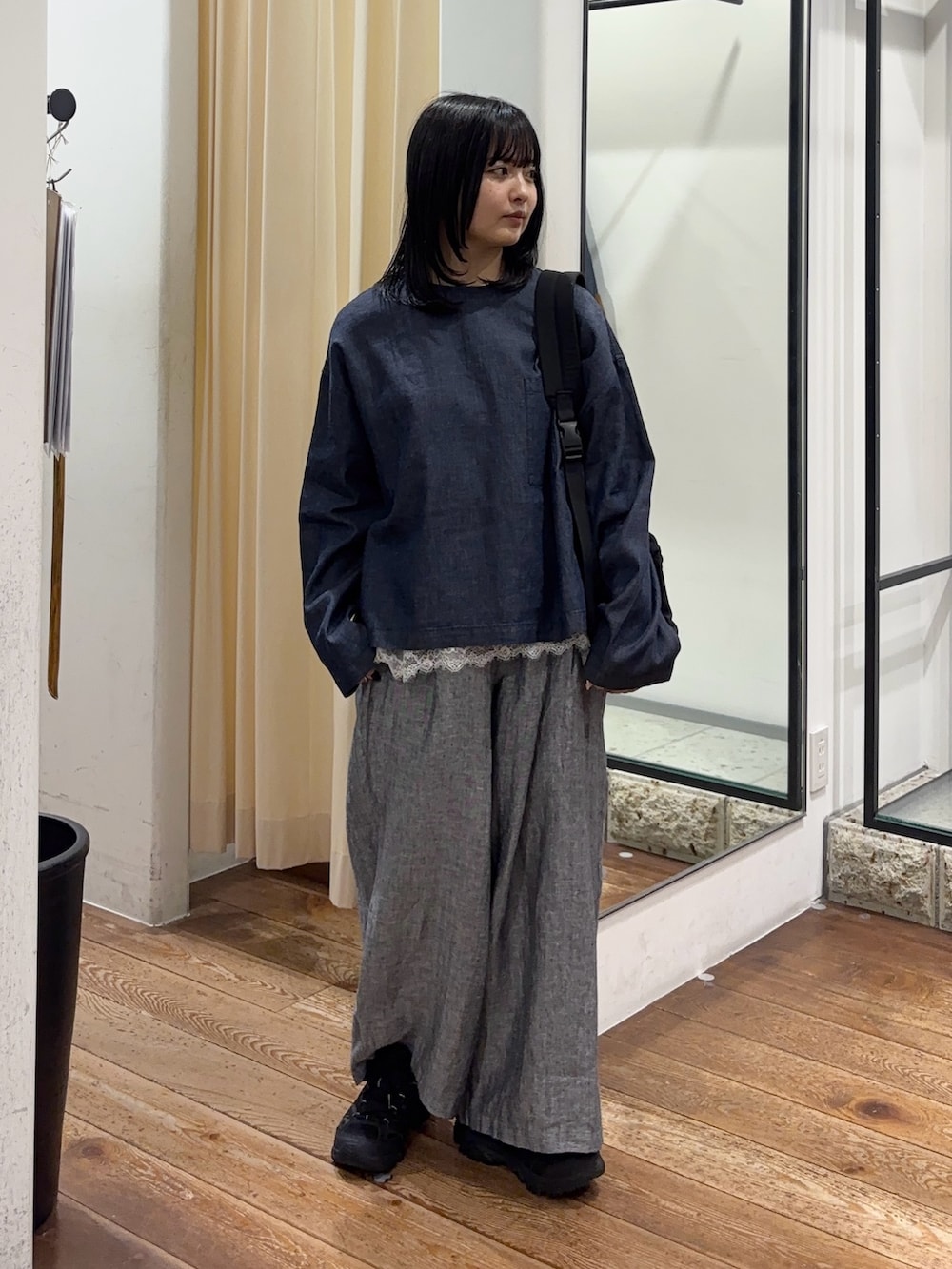 リネン100%のヘリンボーン織り生地で仕立てた、定番リネンをワンランク上に引き上げるシリーズの一本です✨表情豊かな織り柄がナチュラルな風合いを際立たせてくれます◎たっぷりと分量を取ったギャザーワイドシルエットが、