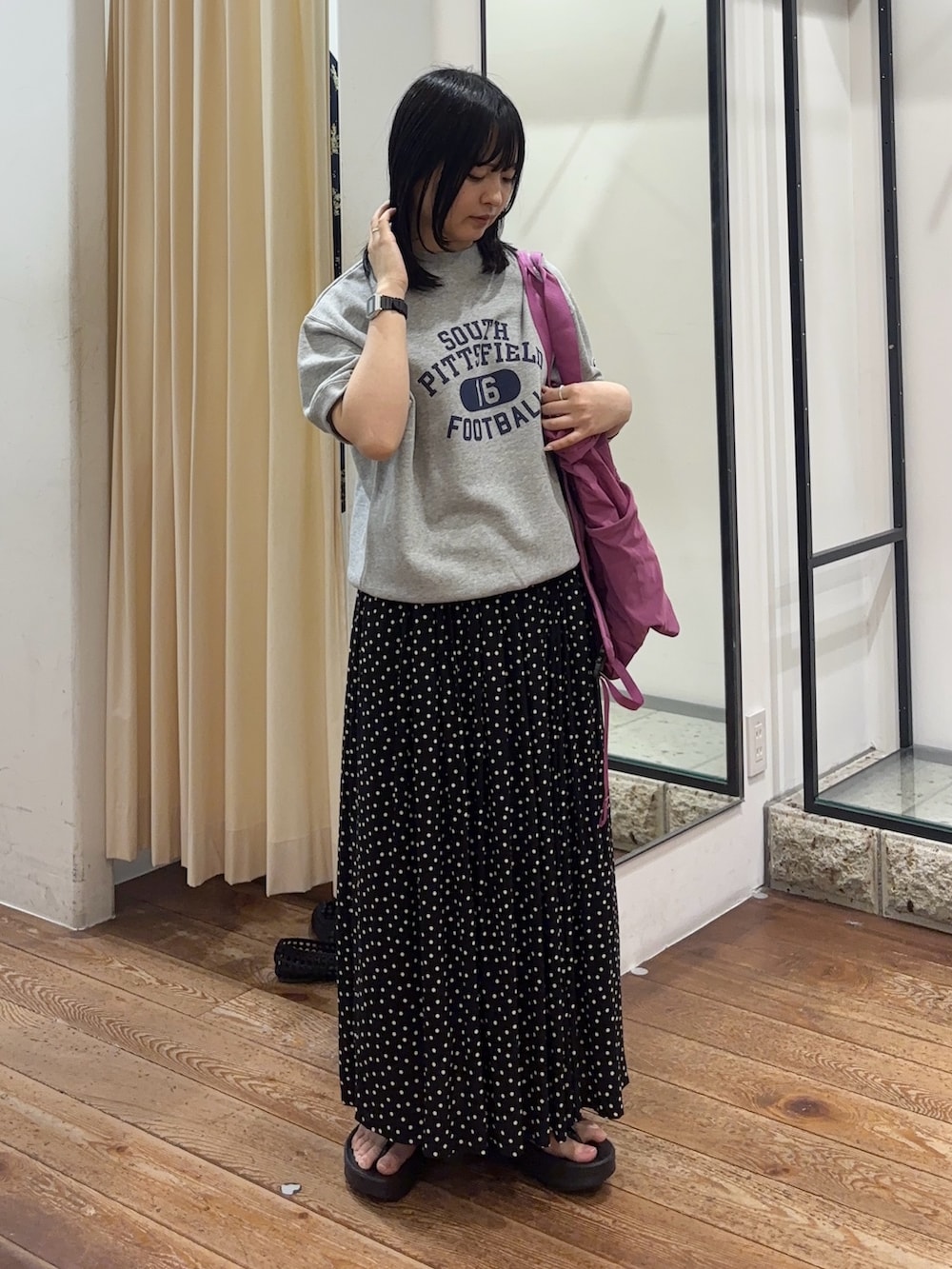 レーヨン素材でとろみのある見た目で、ドットは甘い印象が強いですが、大人っぽく上品に着こなしていただけます◎
