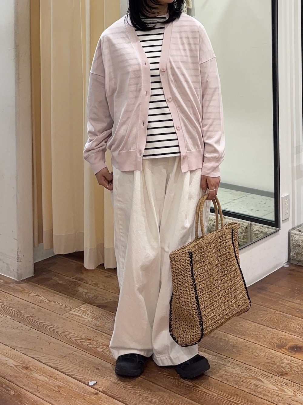 かぐれの新作のデニムで身幅がワイドなので体型カバーもしてくれて、ウエストはゴムなので履き心地もとても良いです😊生地は厚すぎず、薄すぎずなので、長いシーズン着用していただけます!