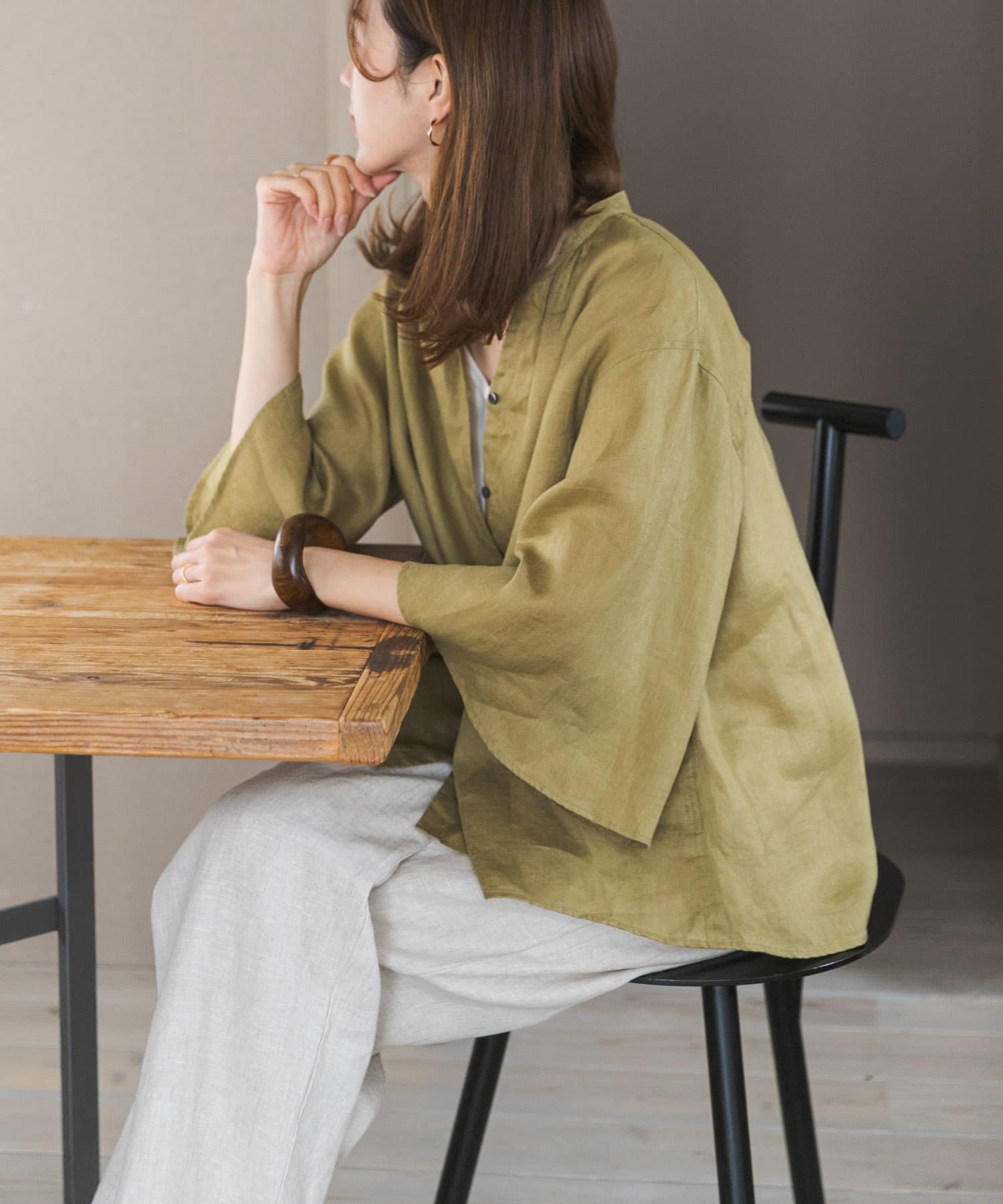 使い込むほどに風合いが増す、天然素材のリネンを使用したブラウスで、袖口を広く取ったフレアスリーブがポイントで、動きのある軽やかなシルエットを演出してくれます◎気になる二の腕まわりを自然にカバーしてくれます✨