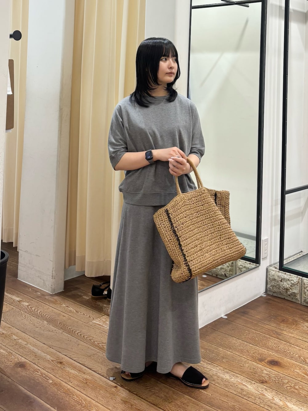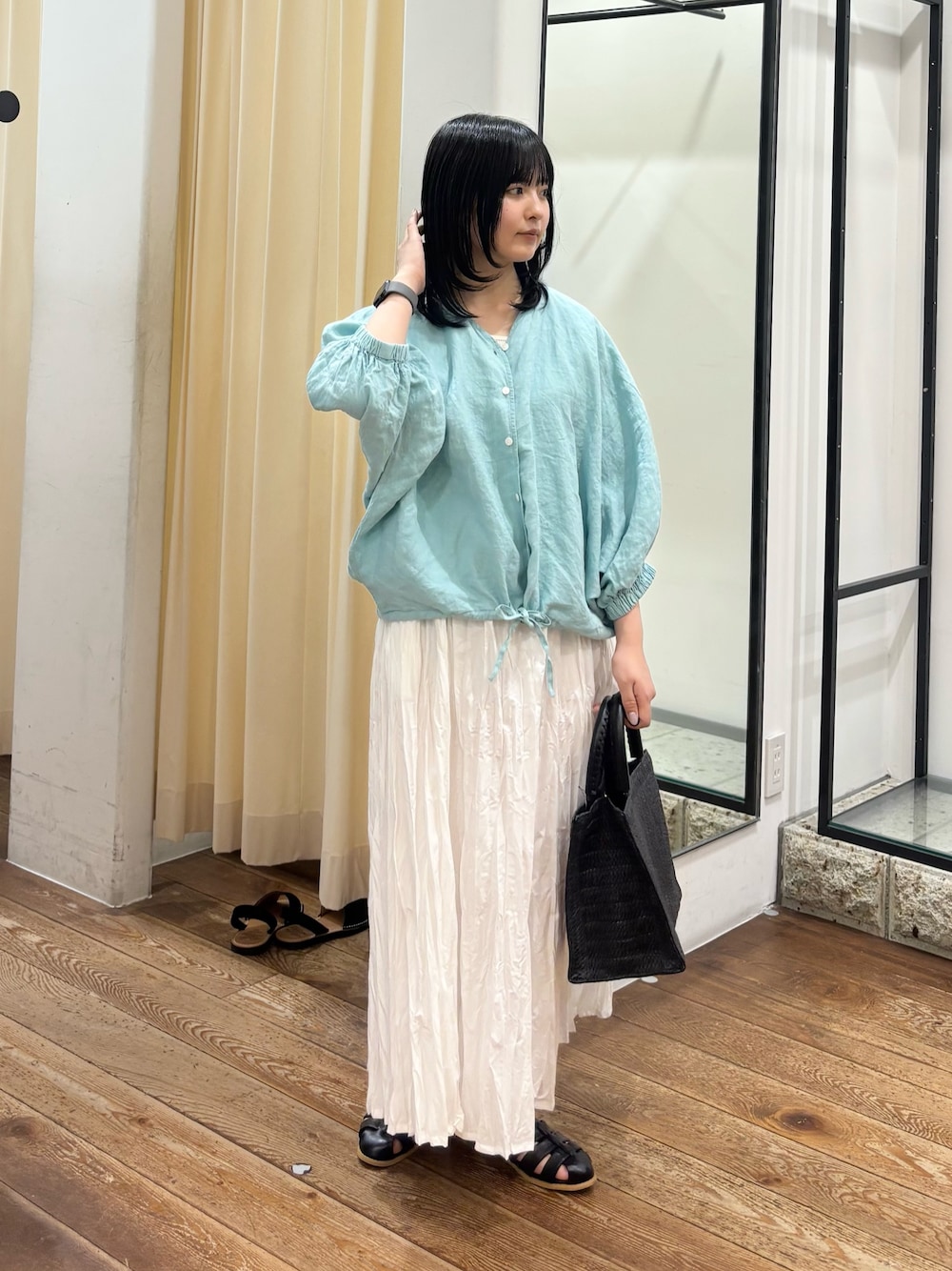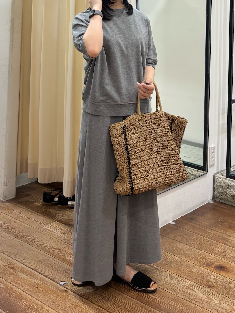 トップスと同素材で出来ていて、ウエストはゴムで履き心地もとてもよくて、セットで合わせるとこなれ感がでます!まだ肌寒い時期はカーディガンや、シャツなどを羽織って合わせるとまた雰囲気が変わります🌿