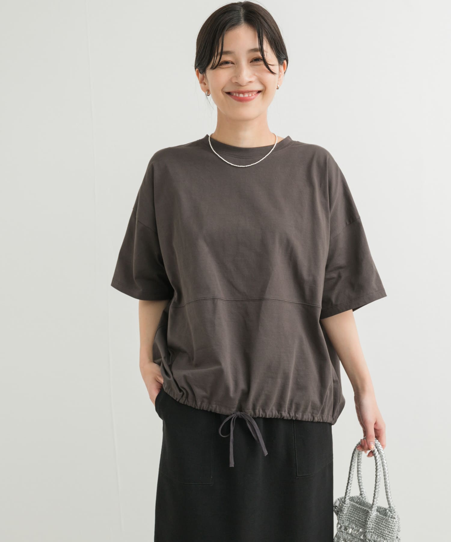 一見シンプルにも見えますが、裾のドロストがとても可愛くて、絞ると丸みのあるシルエットになって女性らしさがプラスされます◎