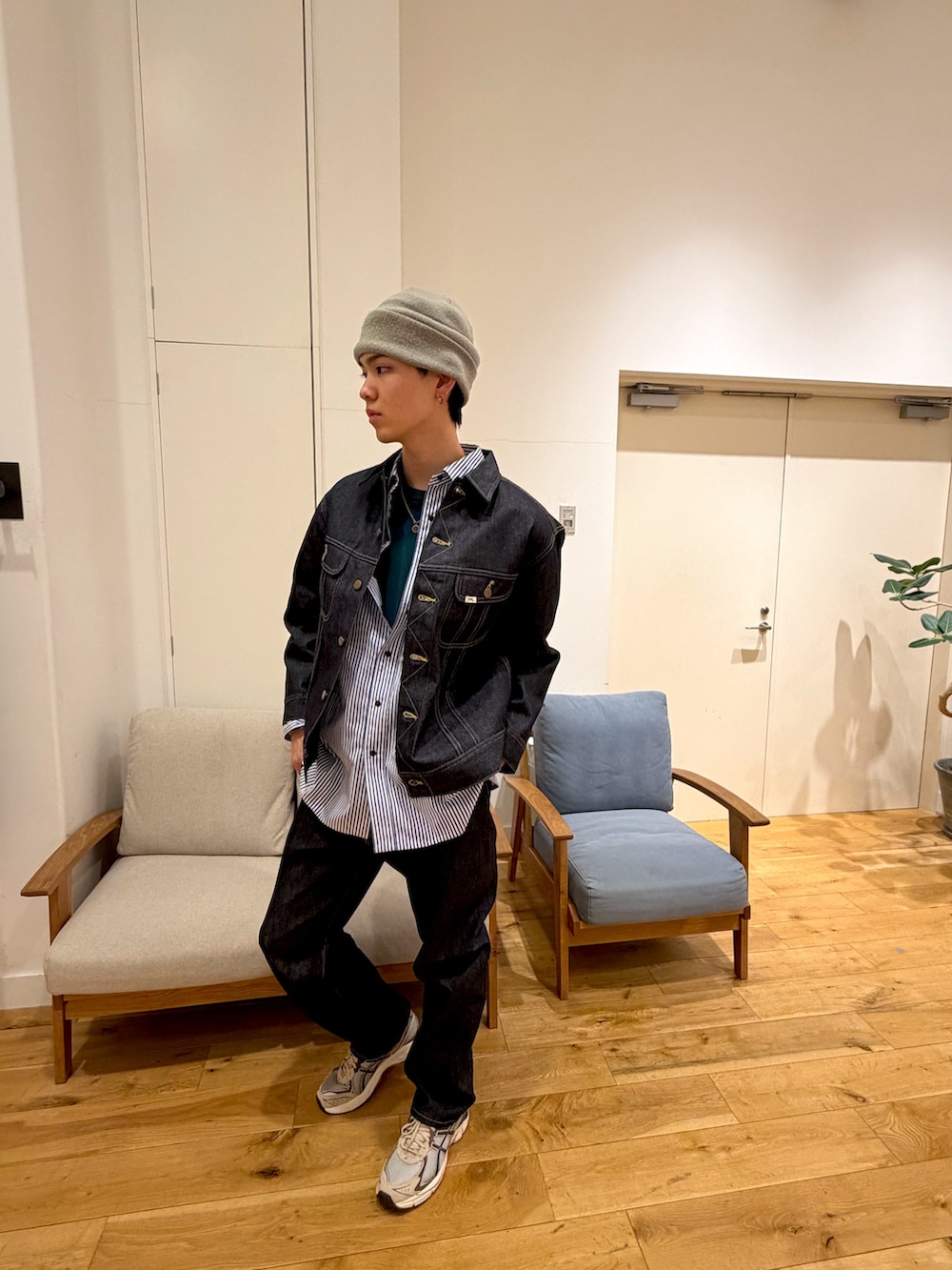 ニット帽や、スポーティなスニーカーでカジュアルさ