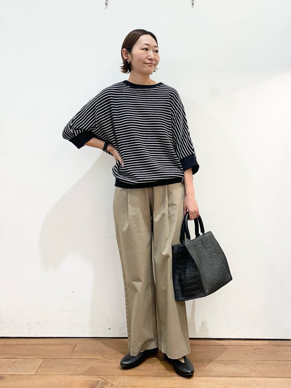 こなれ感のあるアイテムでインナーにプリントTやボーダーTシャツを入れると◎!