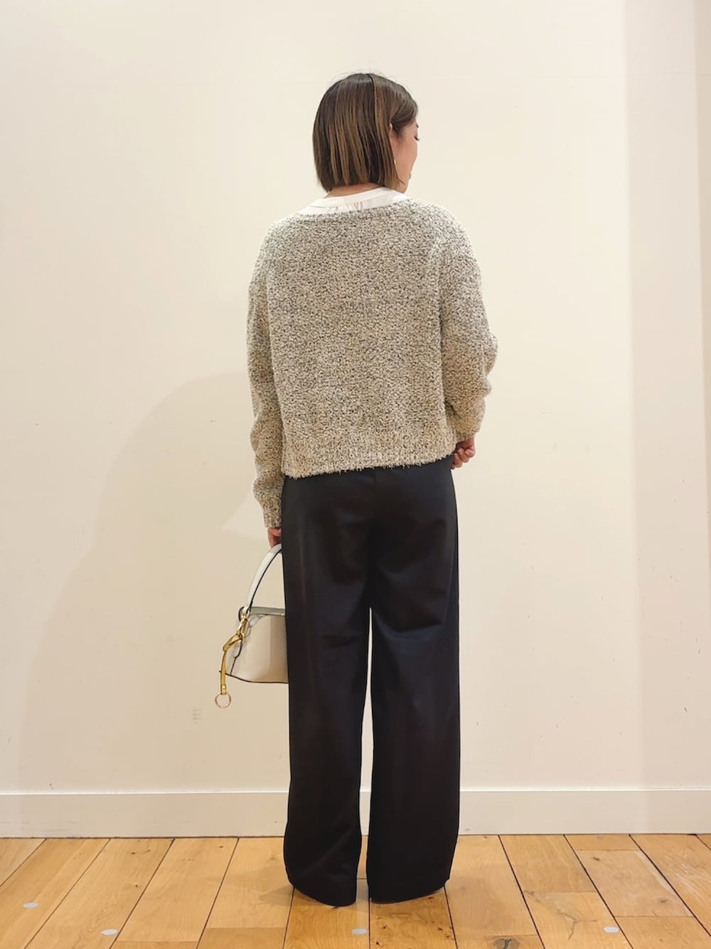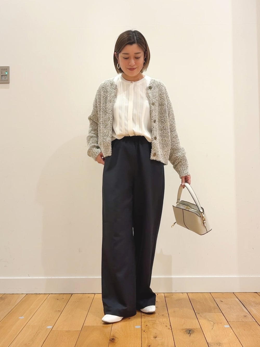 カーディガンはツイードジャケットライクな見た目でブラウスに羽織ると綺麗めに。