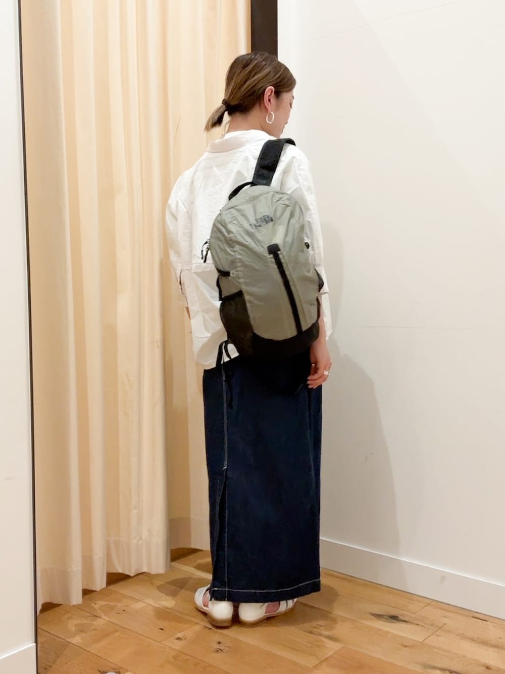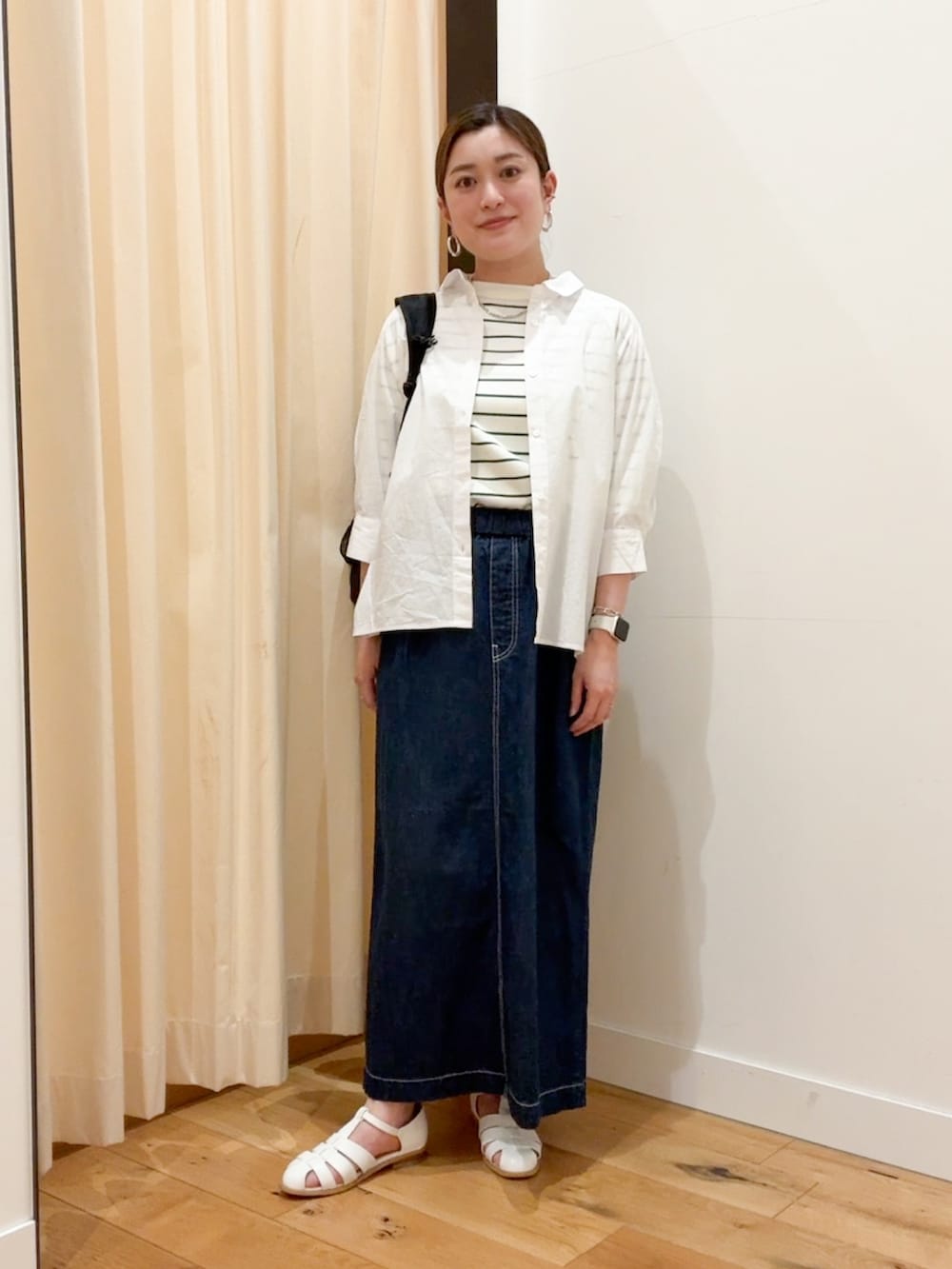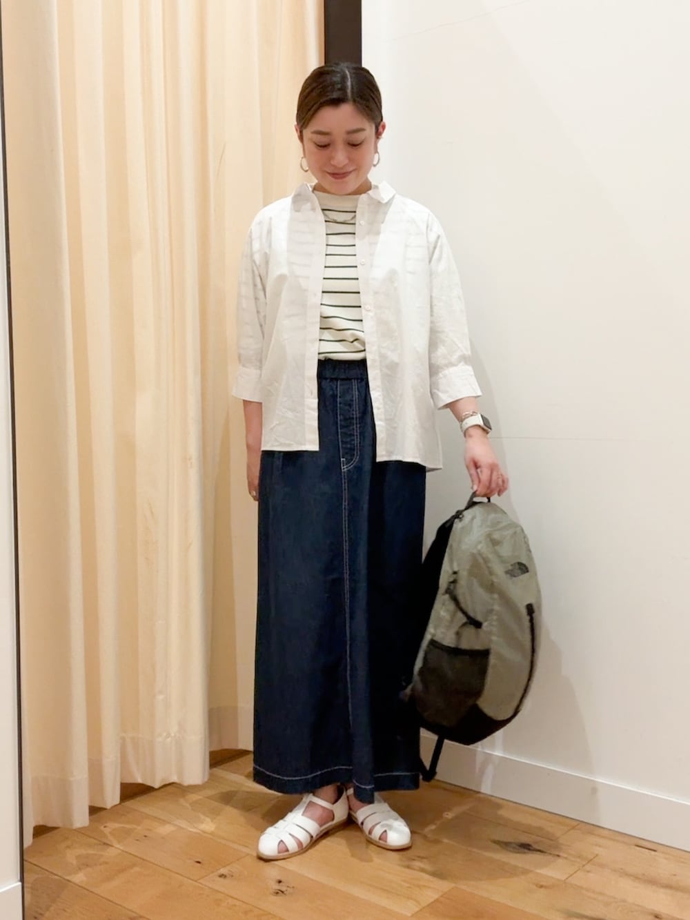 綿麻デニムスカートは着丈が長めで脚が出過ぎないのでサンダル合わせにもちょうどいいです。