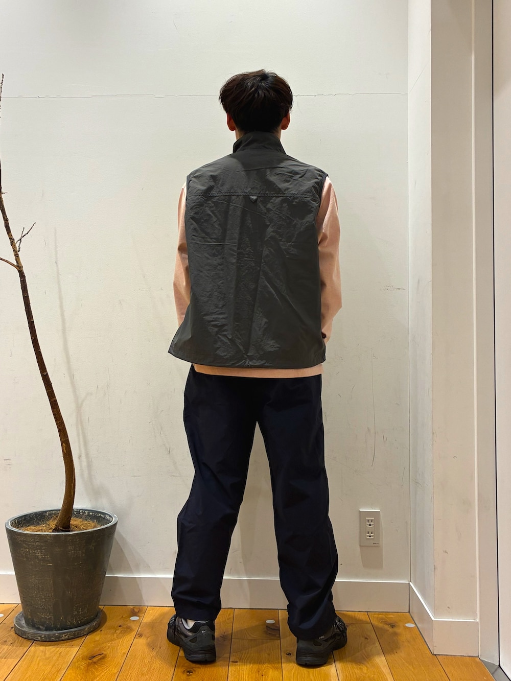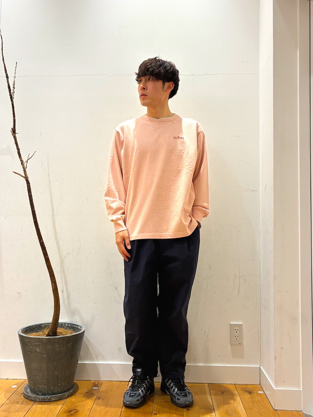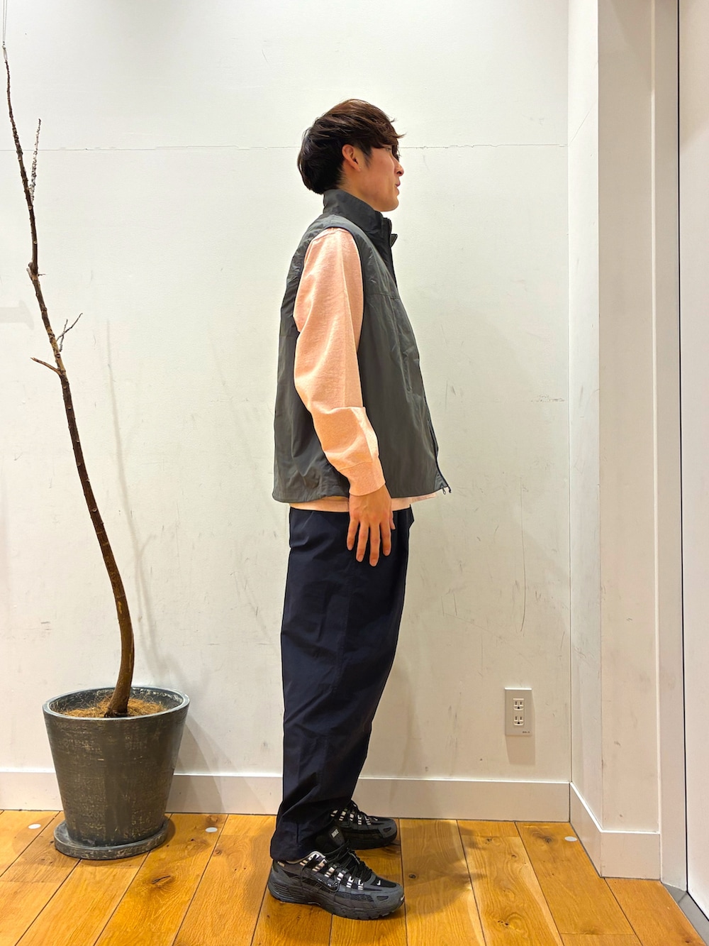ロンTは襟が特徴的で、二重になっていて中は白、外はピンクの色になっています!又、パンツは会うおどあコーデになるようにトラウザーを履いています!このパンツとベストはセットアップでも着る事が出来ます!!