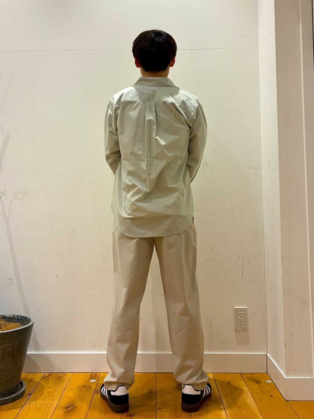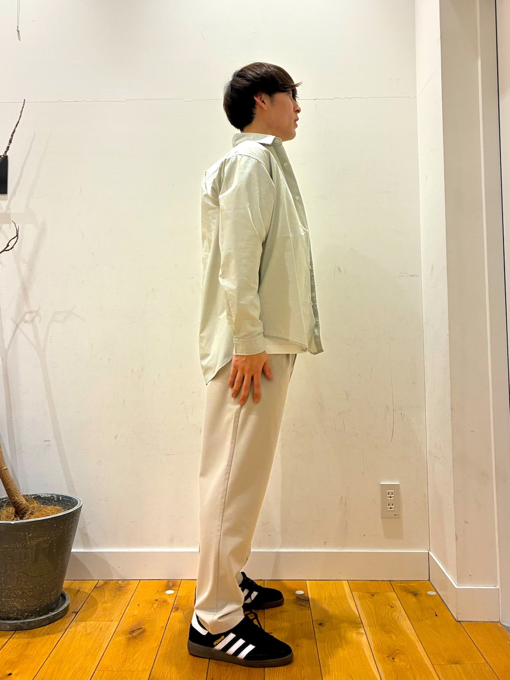 中にllbeanの胸ロゴが刺繍されており、襟が特徴的なロンTを着て上には春らしい緑のチェックシャツを着ています!パンツはテーパードがかかっていて柔らかい生地を使用している物を使用しています!