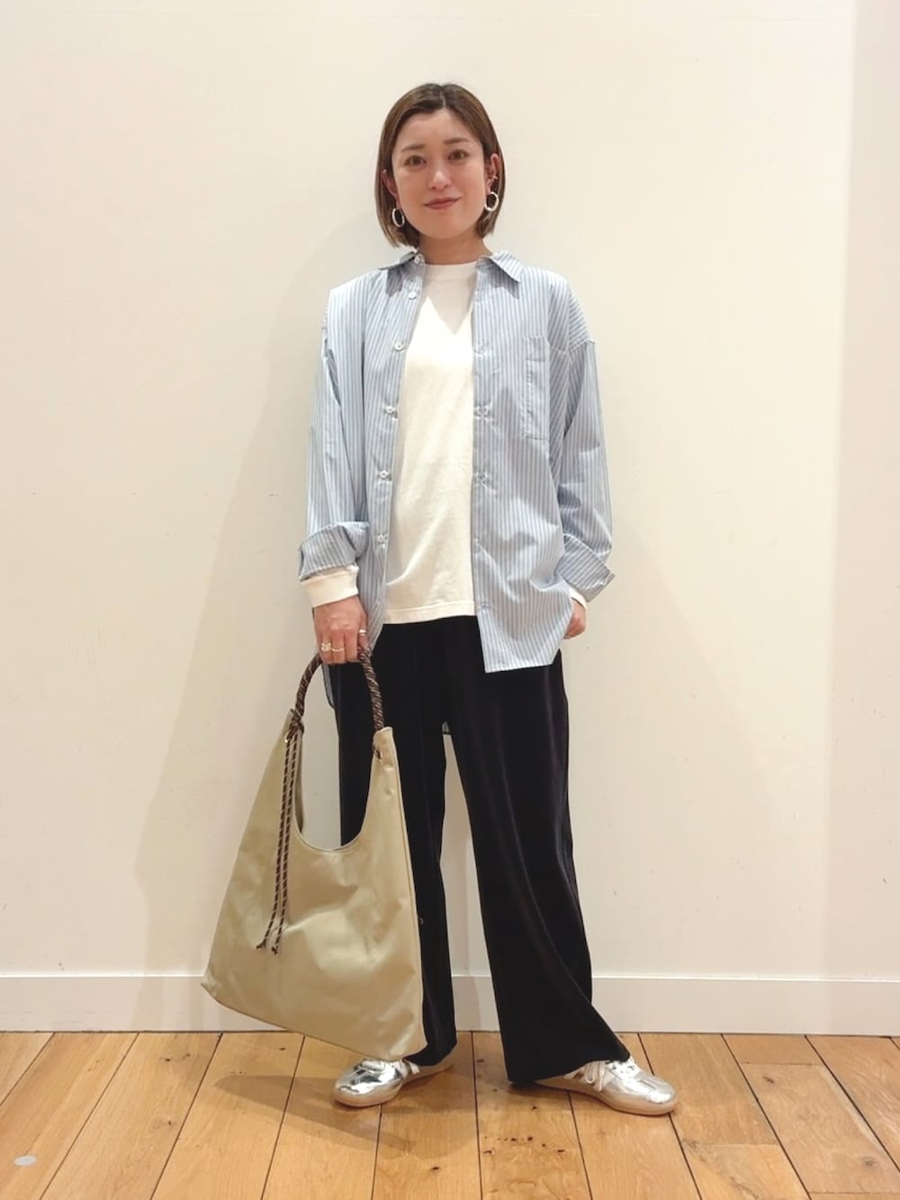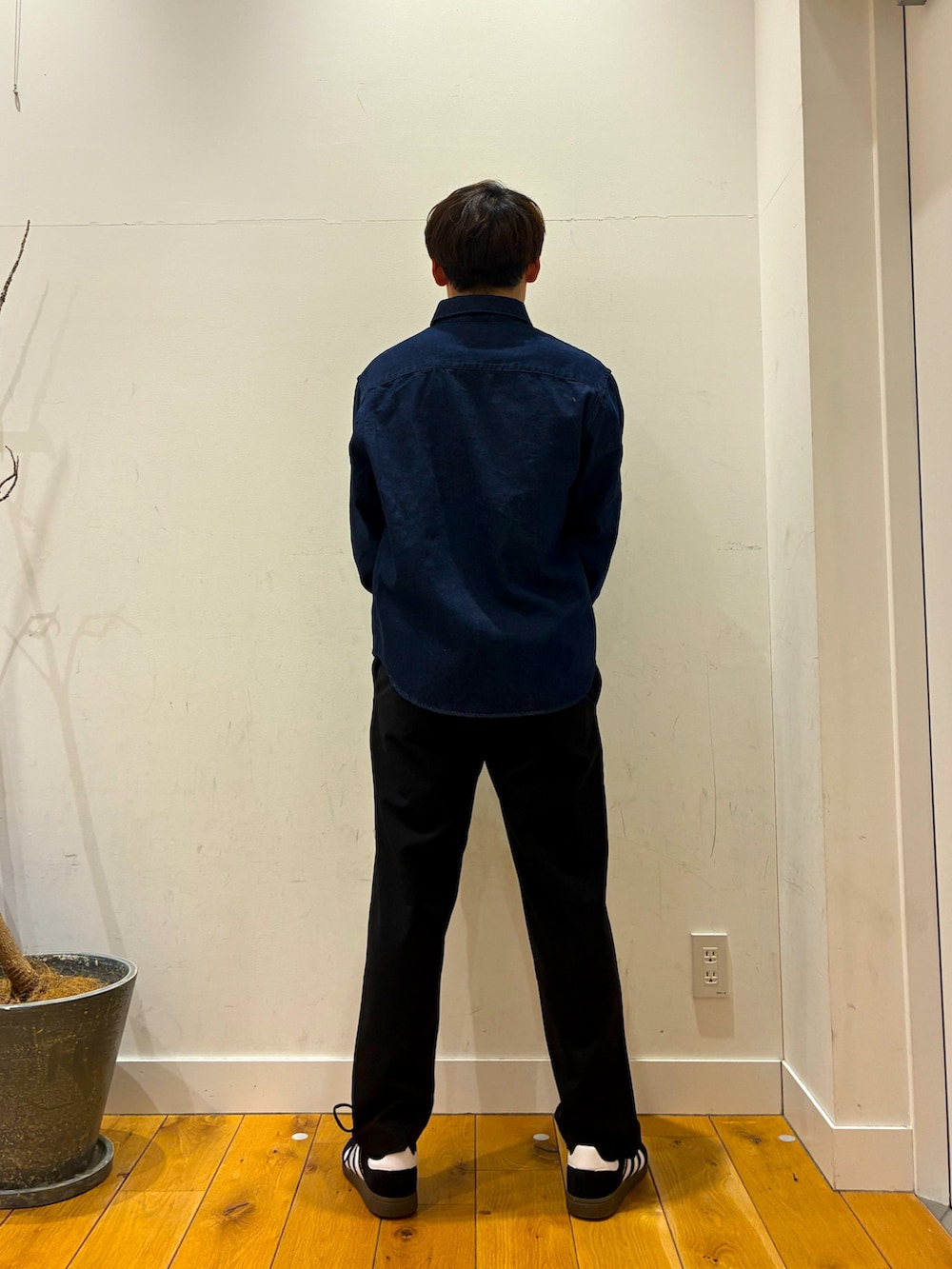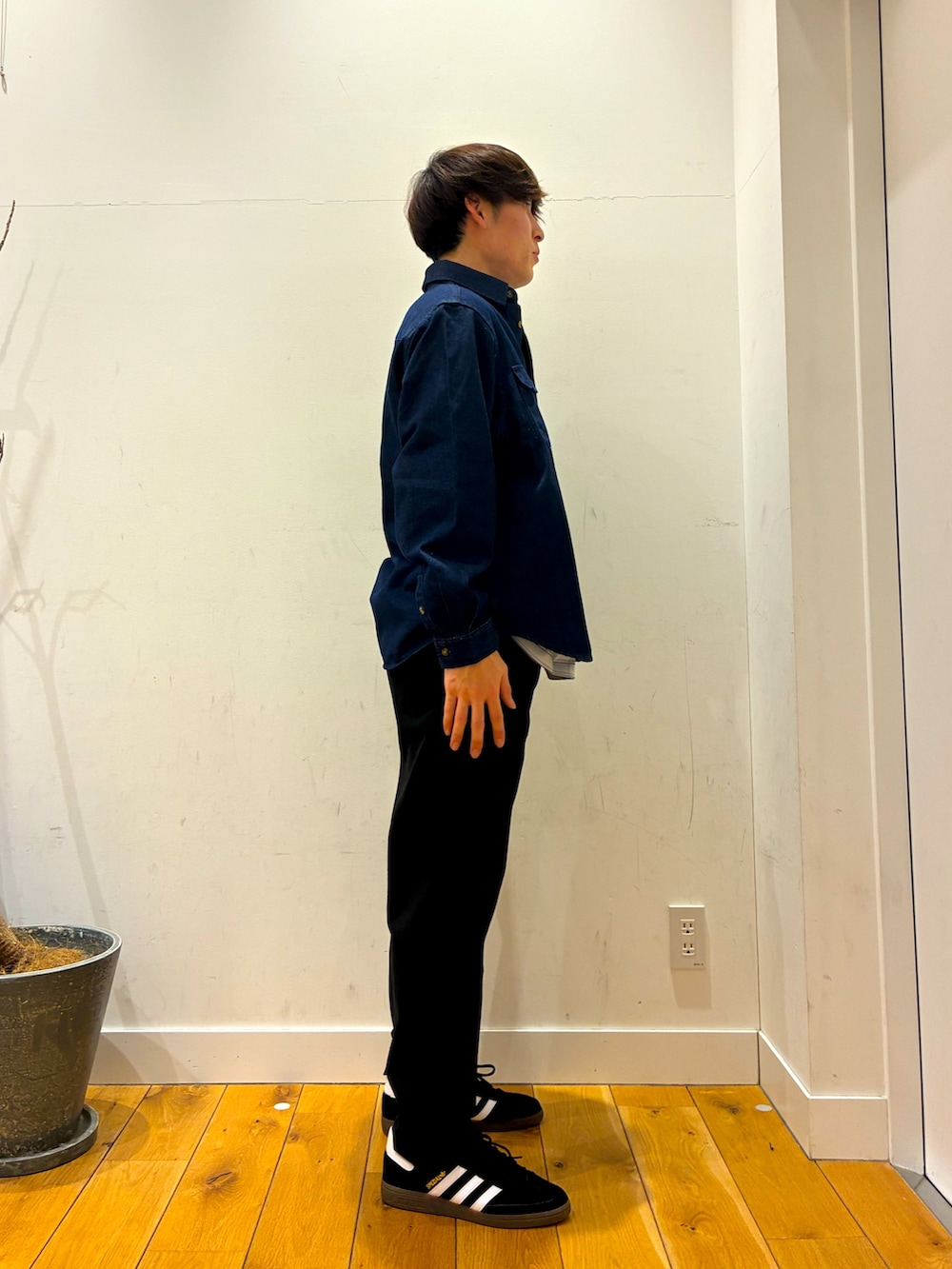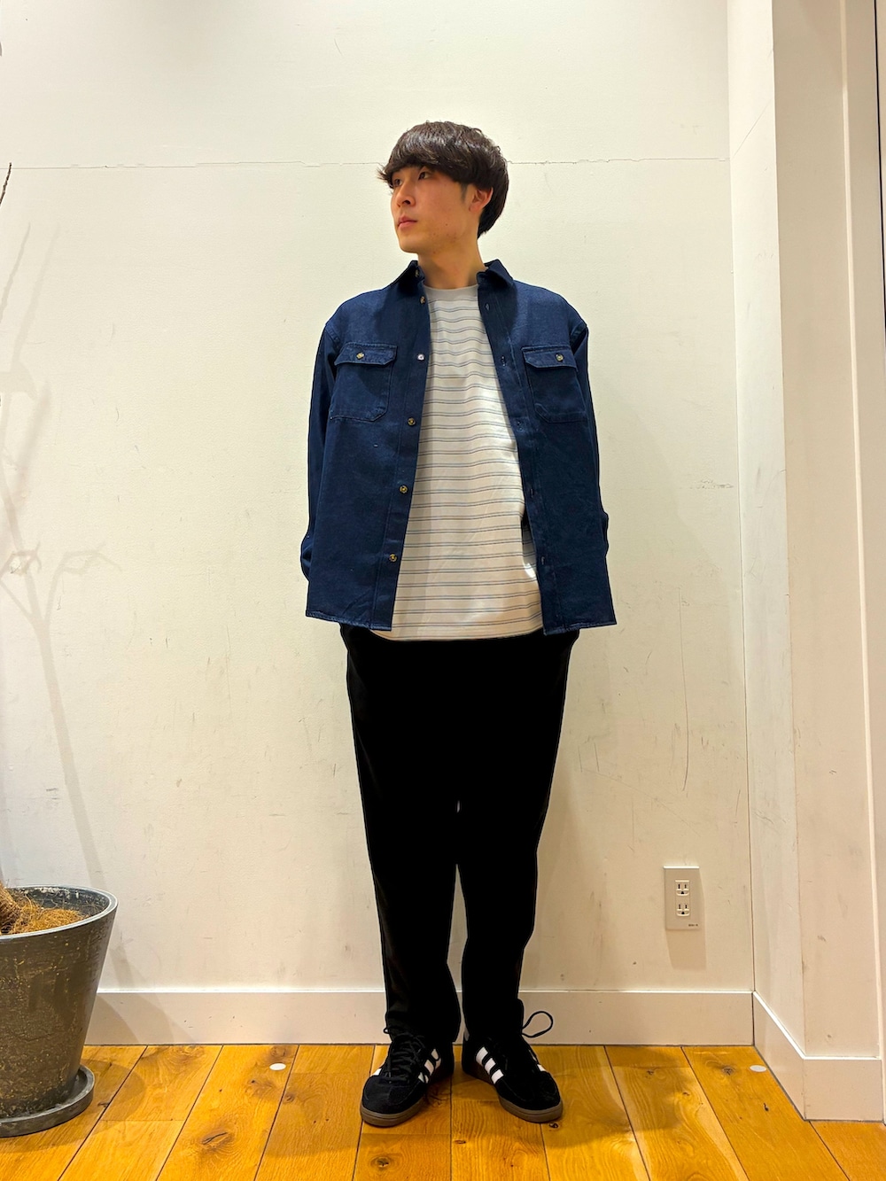 中にthe FOXのゆったり目のボーダーロンTを着ています!その上に柔らかい生地になっているワンウォッシュのデニムシャツを着ています!そこにテーパードがかかっている柔らかい生地のパンツを履いています!