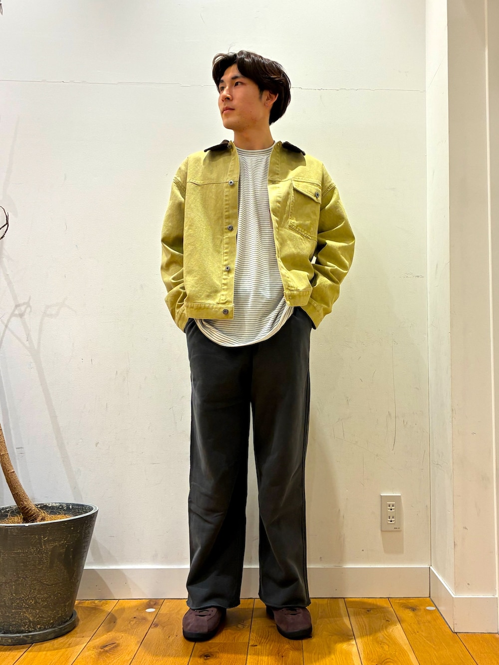 中にゆったり目の形をしたボーダーロンTを着て上には短丈でカラーが特徴的な柔らかなジーンズ生地のジャケットを着ています!!