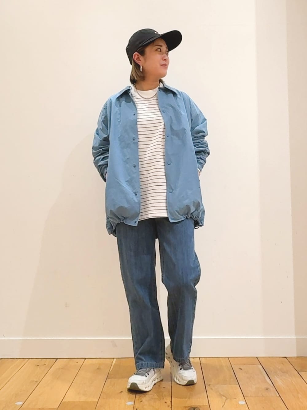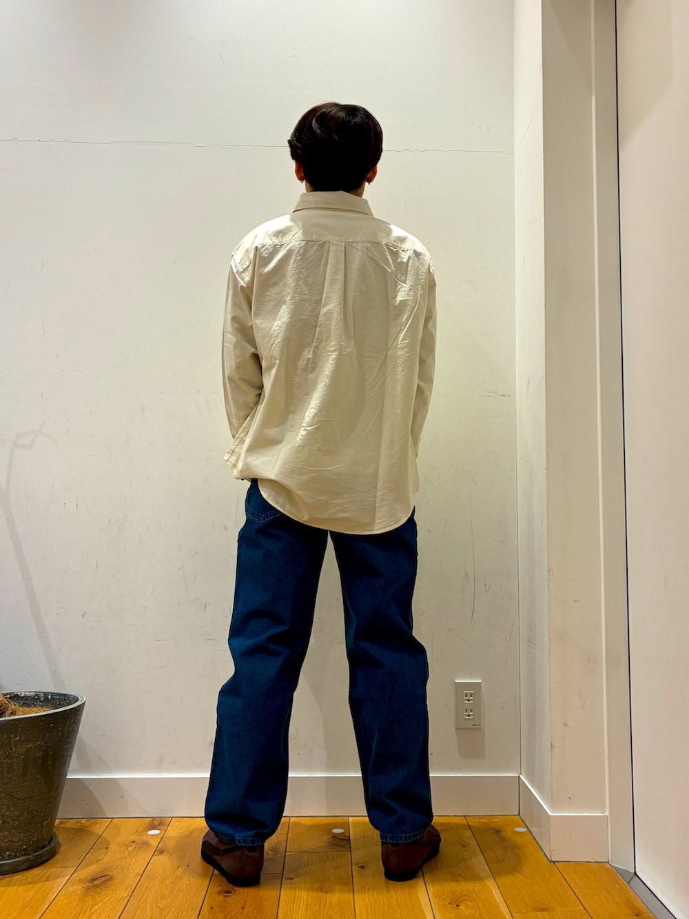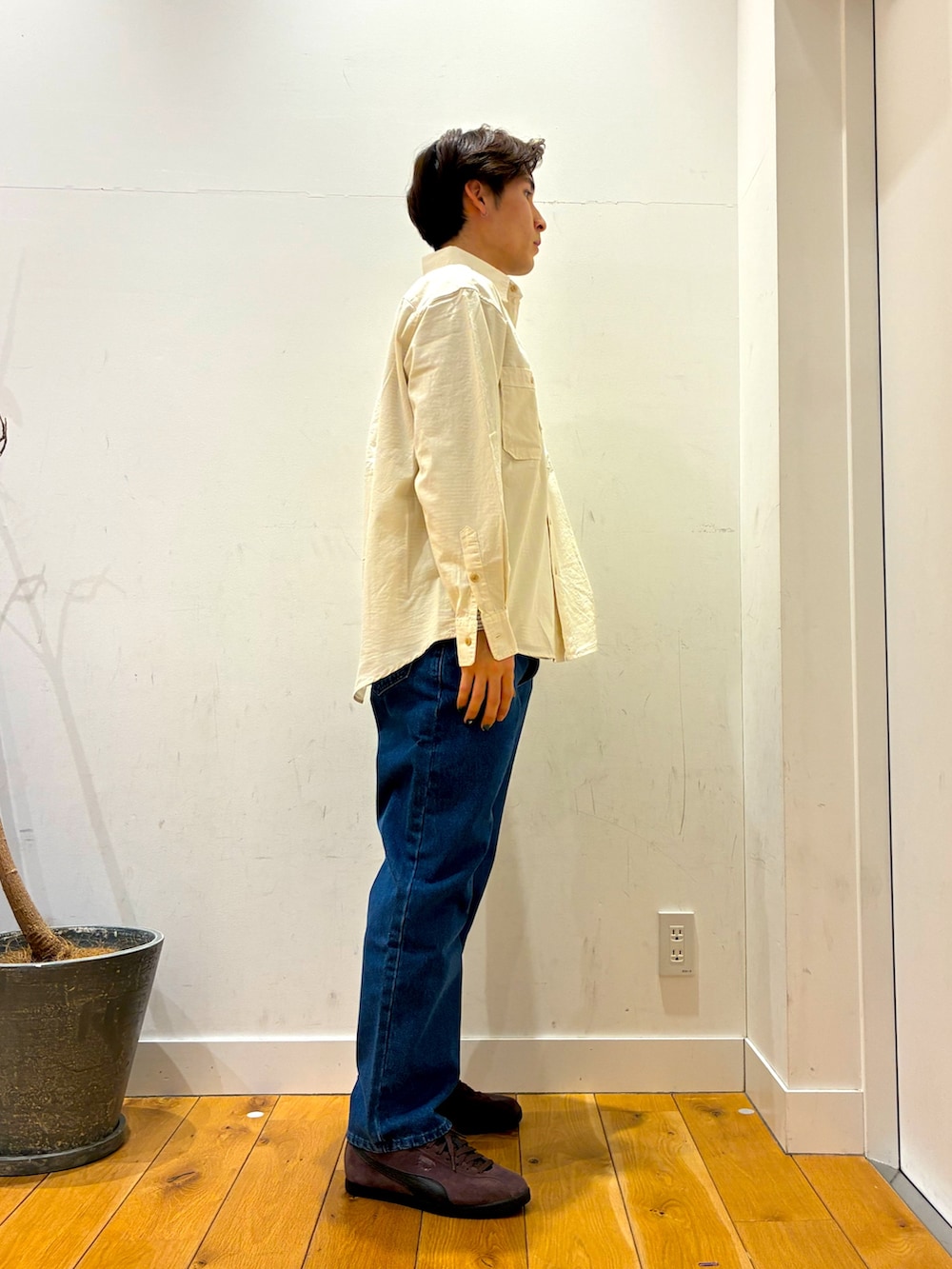 春コーデになっている為、インナーはゆったりとしたシルエットで生地は柔らかく薄いです!!その上にダブルポケットが特徴的でとても軽く着られるシャツになっています!!下にはゆったりとしたジーパンを履いでます!!