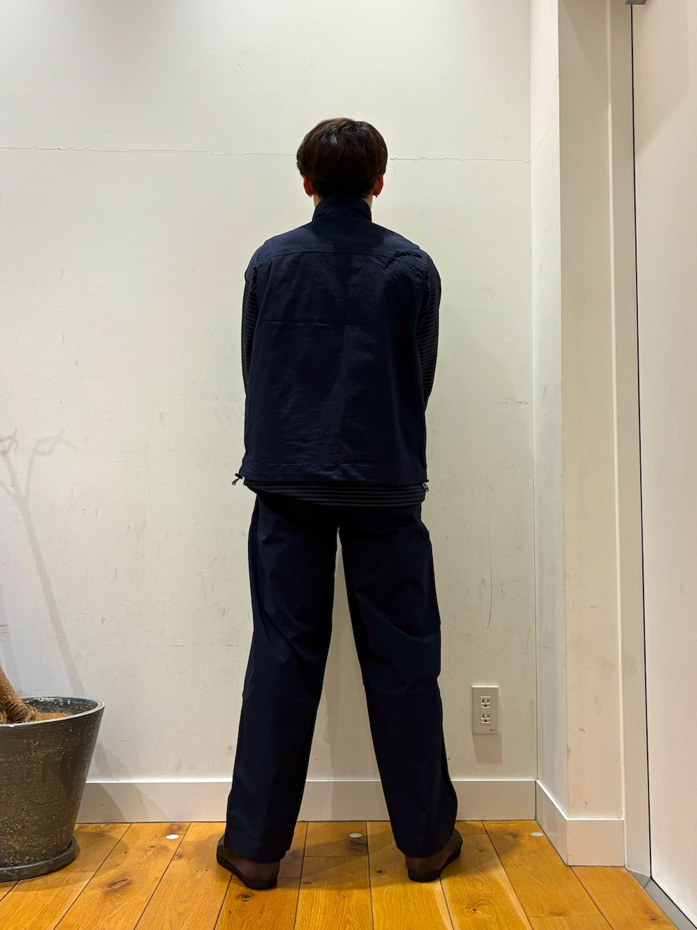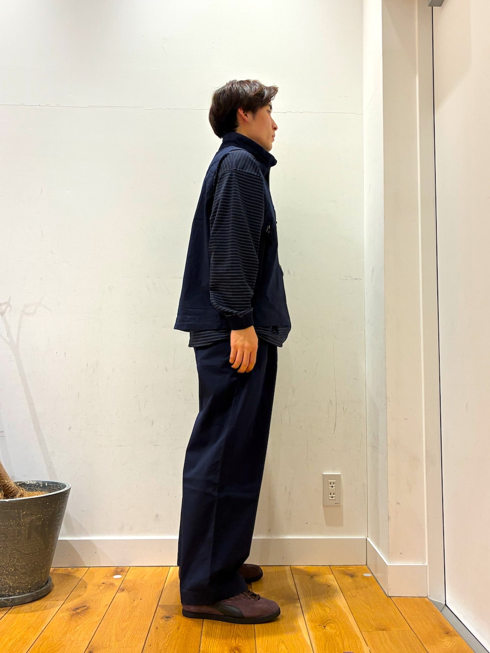 中にゆったりしてサラサラ生地で作られているボーダーロンTを着ています!ベストは中がメッシュになっており、春先でも使える物にっています!パンツはゆったりした物でベストとのセットアップになっています!