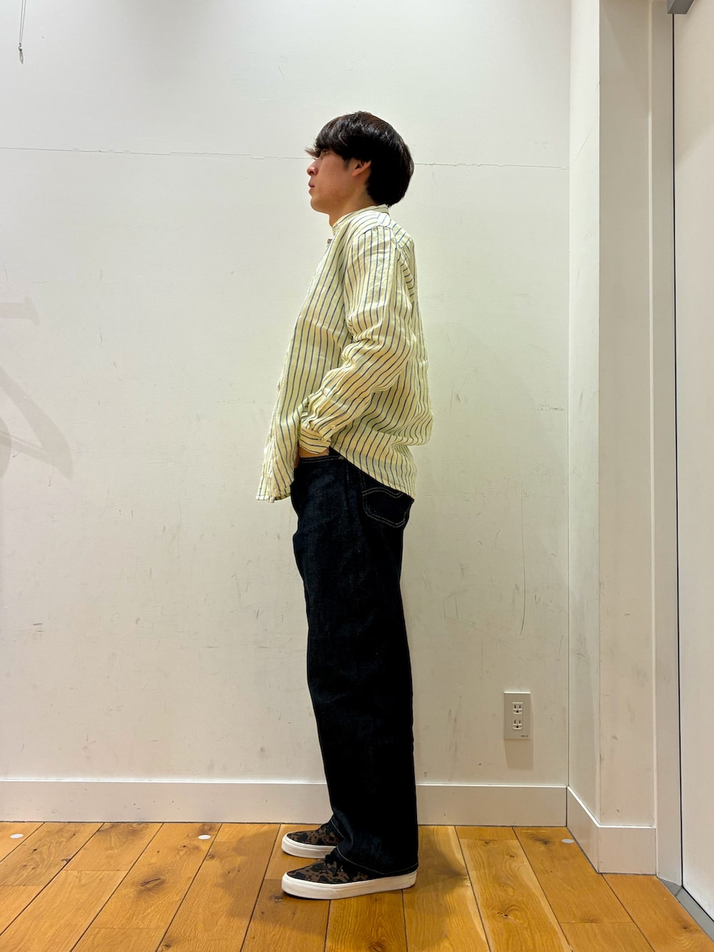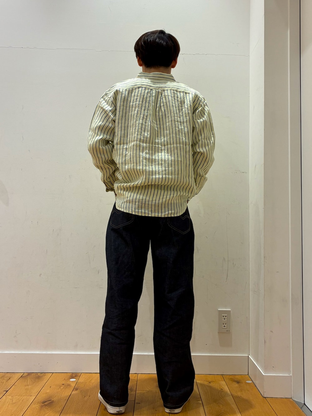 中にはクイックドライと言った防しわや速乾性などの多くの機能がある生地を使ったロンTを着ています!その上にリネン生地のストライプシャツを着ています!パンツはLEEから101のridersモデルのパンツを履いています!!