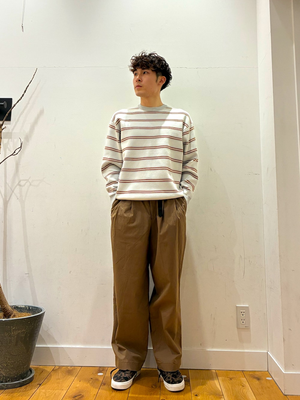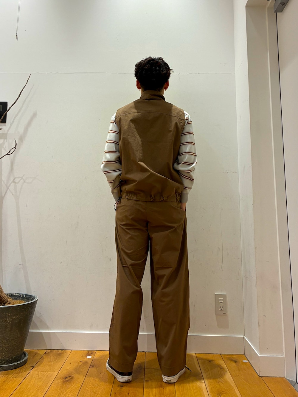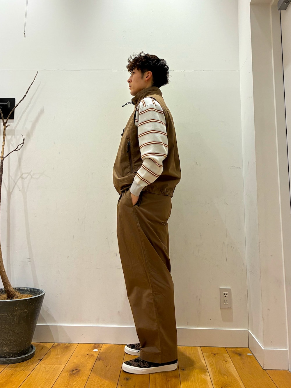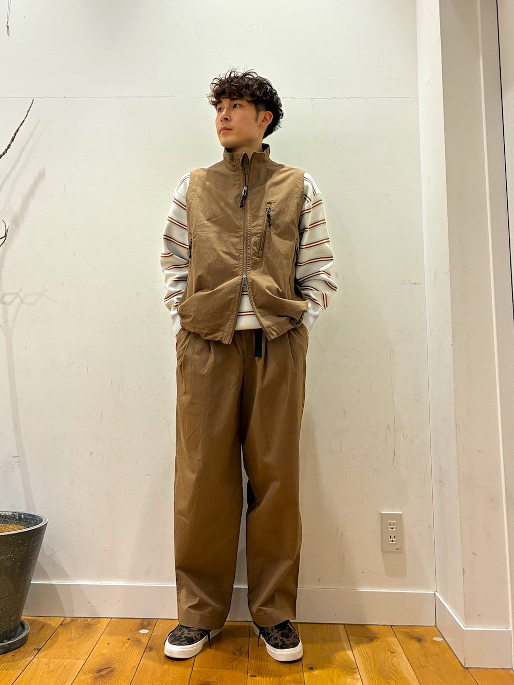 中にはスタッフやお客様からの声を頂き作られた完声ニットを着ています!洗えたり、防汚などの機能が付いている優れたニットになっています!!その上にパンツとセットアップになっているナイロン製のフィールドベストを着ています!パンツはゆったりとしていますが、ベルトがついていて調節可能になっています!!