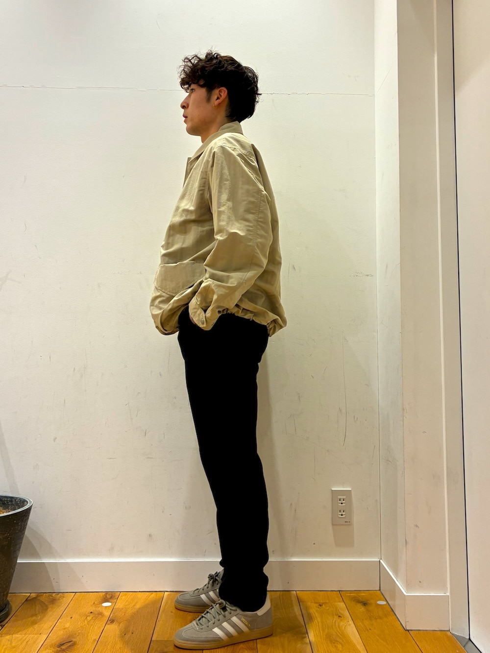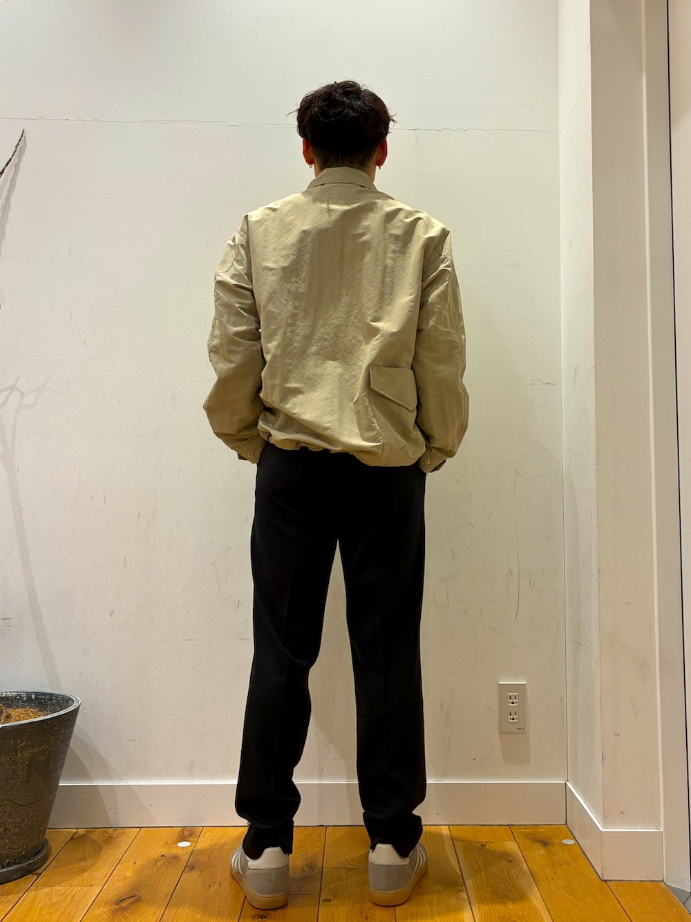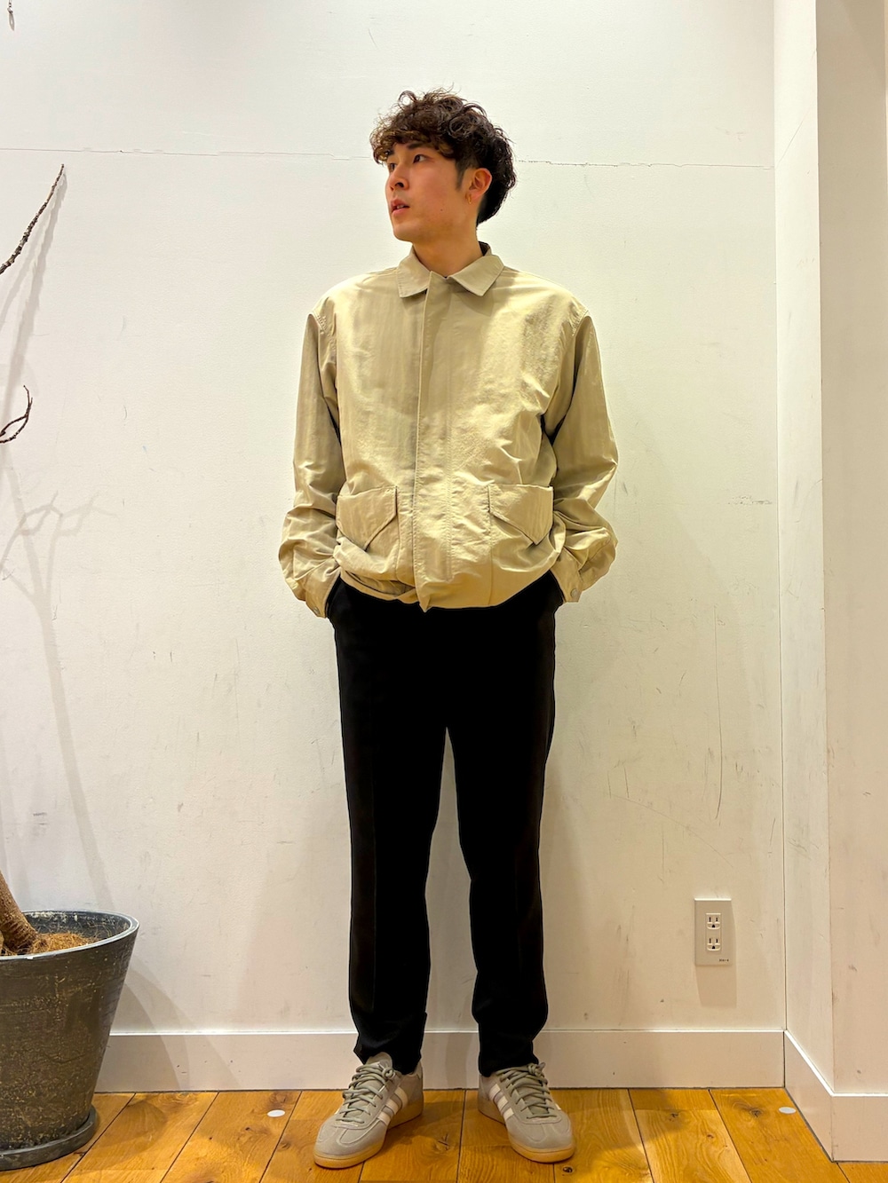 中にはかのこ生地になっていて腰のところはキュット絞られているのでとてもシルエットが綺麗に見えるアイテムになっています!!その上にスノーピークのジャケットを着ています!小雨や風を防いでくれる優れものになっています!!パンツはウォッシャブルやイージーケアピリング防止など色々な機能を持っているアイテムになっています!!