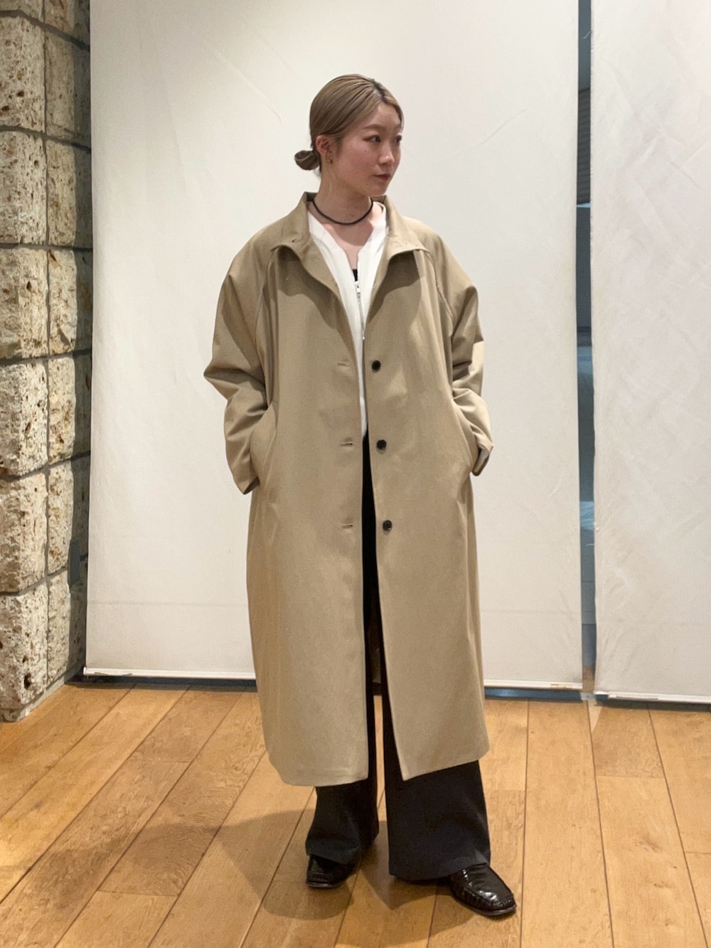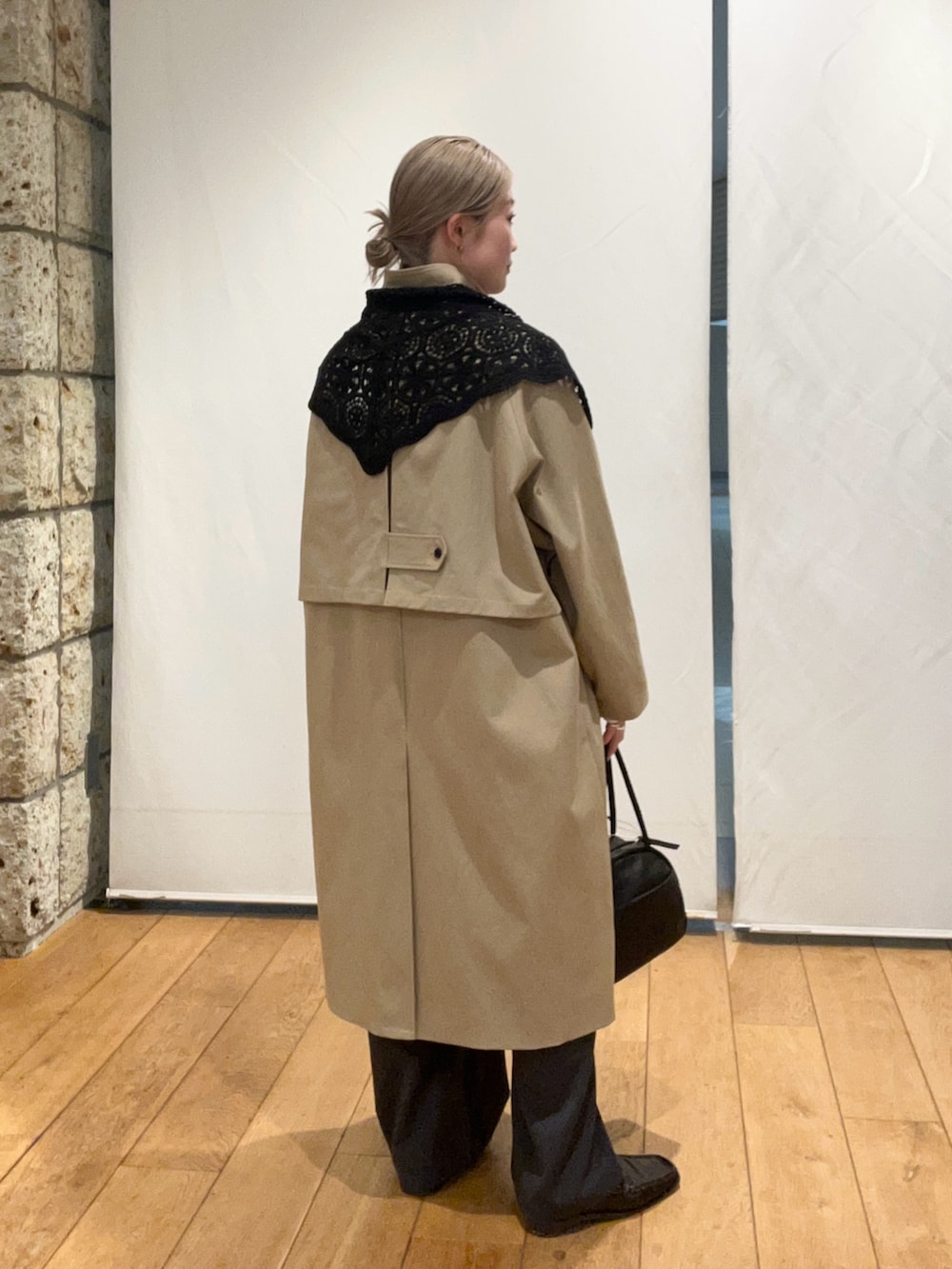 これからの時期にぴったりなロングアウター!黒のレーススカーフを合わせるだけで雰囲気が変わっていいです◎