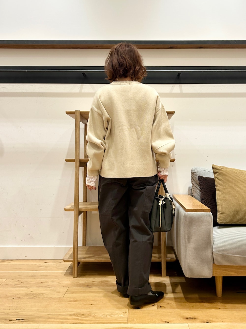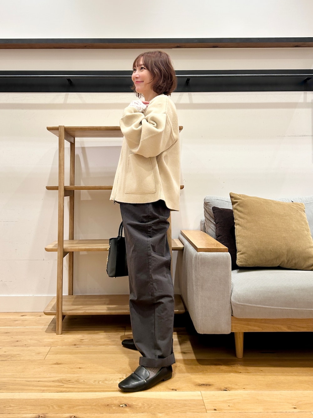 よくあるニットカーディガンとは違い、形は立体感のあるブルゾン、そしてアーム周りも今時アウター的なゆったり仕様でデザイン性のあるトップスの上からでも余裕で羽織れます◎