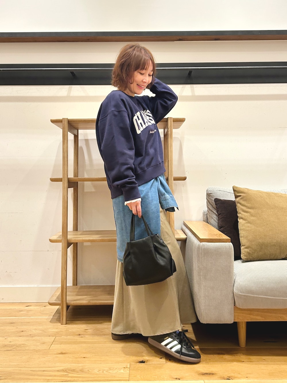 ロゴはしっかり存在感があるのに、着てみると意外と落ち着いた印象で、大人カジュアルなスウェット。