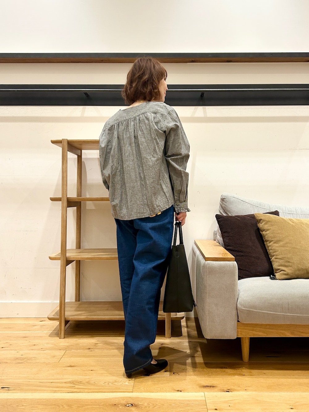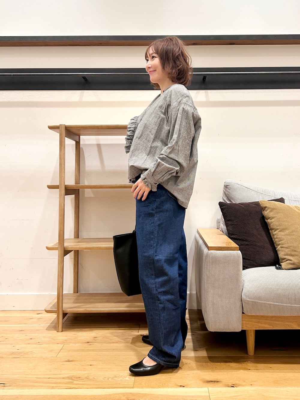 ストンと落ちるストレートシルエットなので、ゆるっと見えて実はすっきり。トップスをコンパクトにまとめるだけでバランスが取りやすいです◎