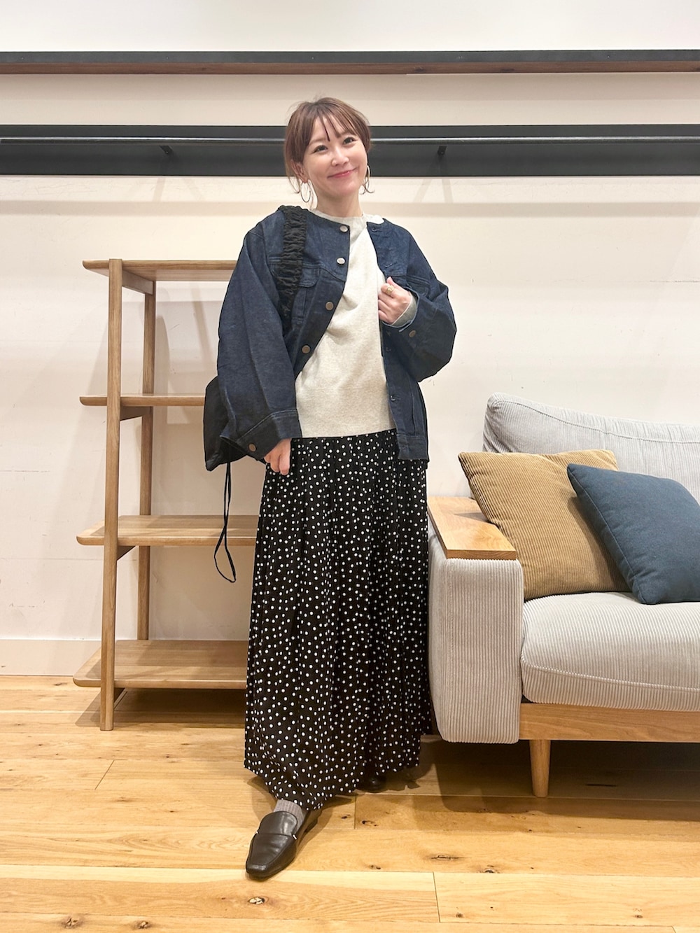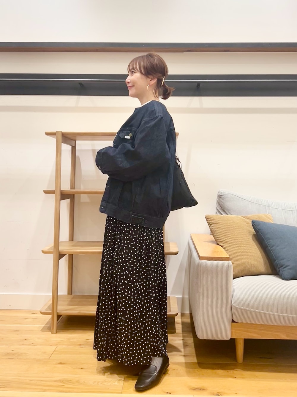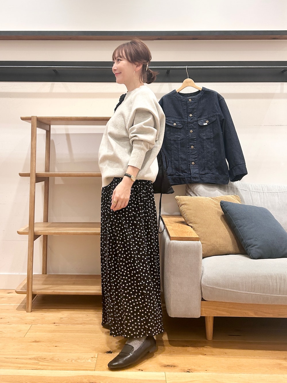 程よくゆとりのあるサイズ感なのでサッと羽織りやすく、きれいめスカートやワンピースと合わせると、大人っぽいカジュアルにまとまります。