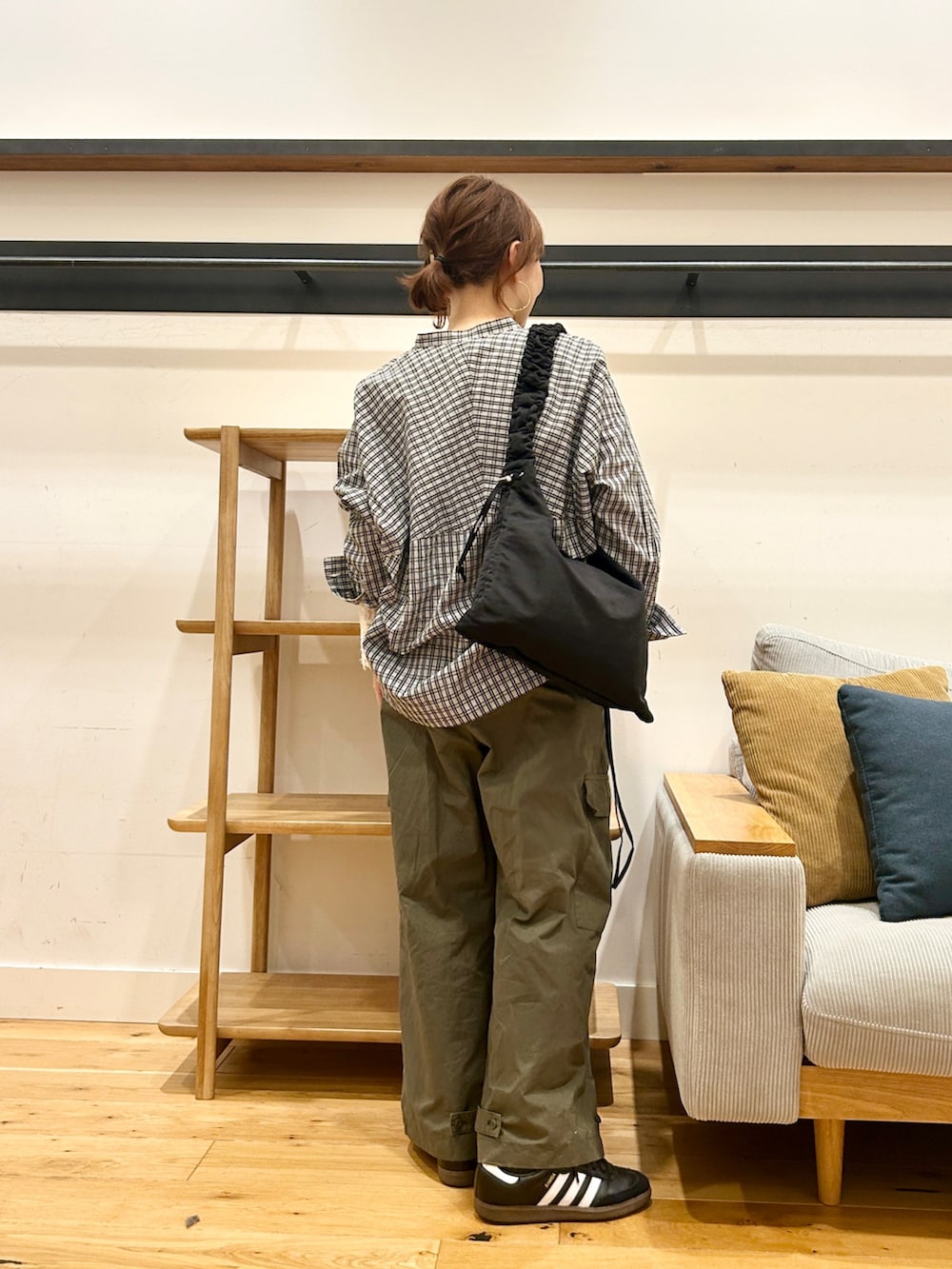 裾を留めるだけでシルエットが変えられるので、その日の靴やバランスで調整しやすいのがポイント。ザバっと履ける気軽さと太さがかっこいいこちら。