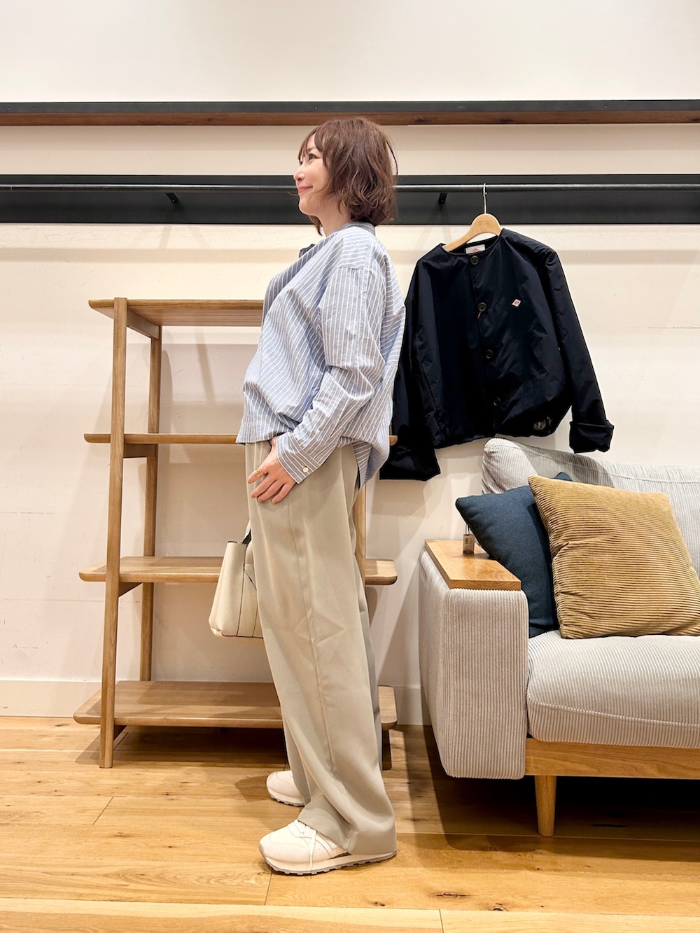 シンプルなストライプシャツですが、ゆるっとしたコクーンシルエットで、体のラインを拾わず抜け感が出ます。