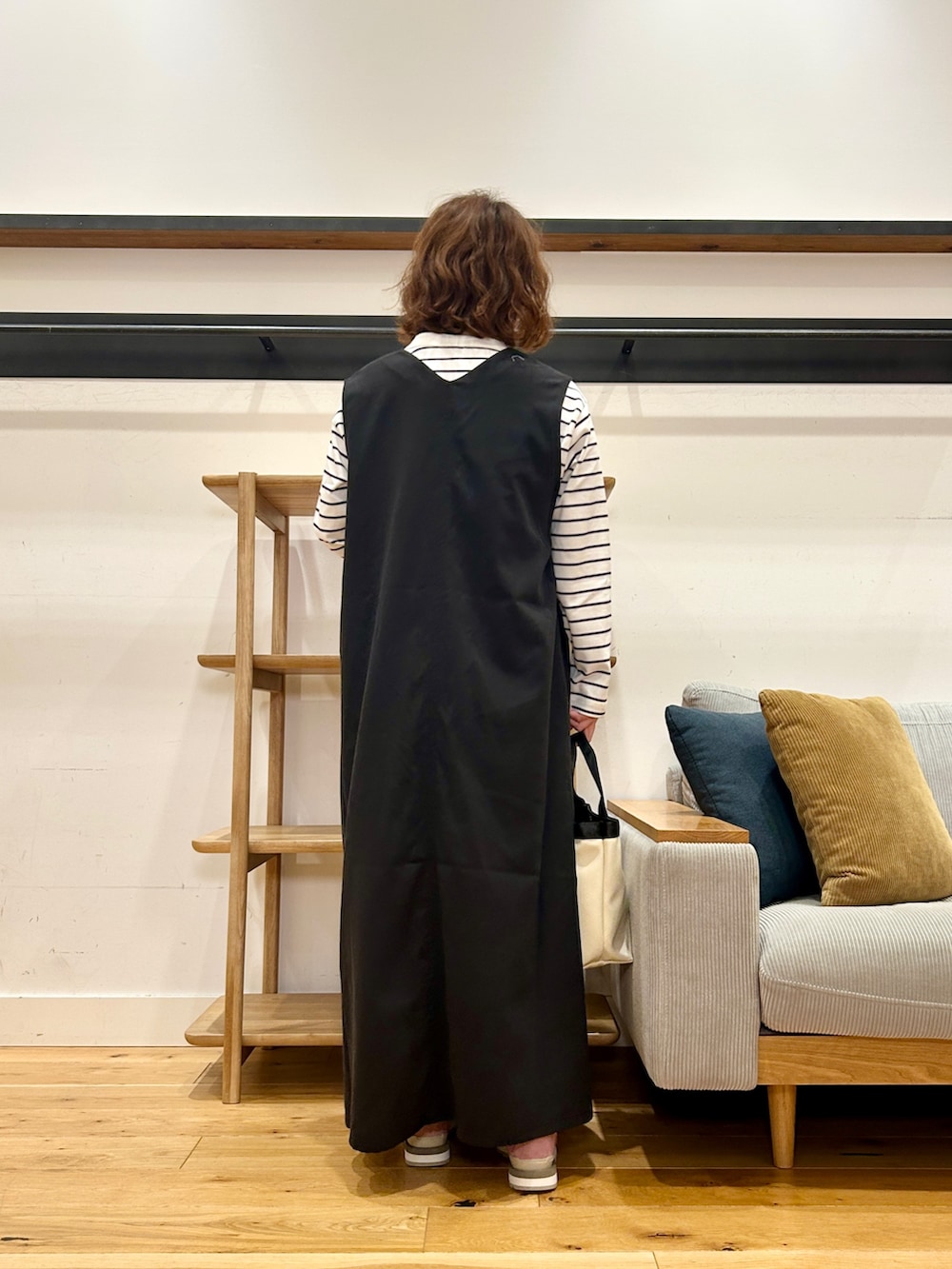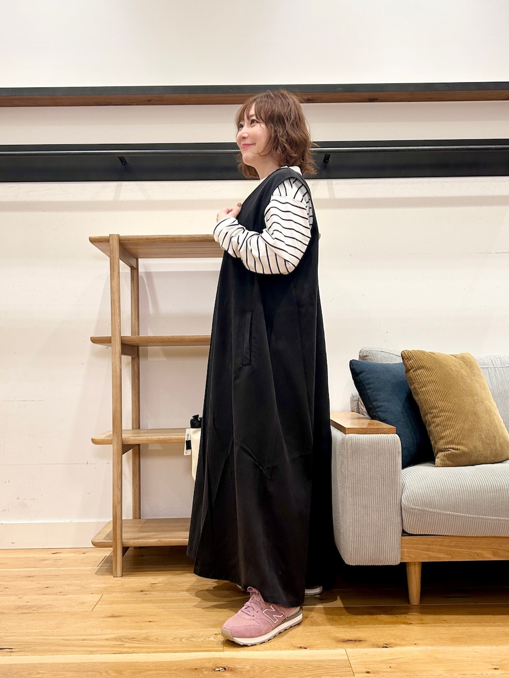 身体のラインを拾わず綺麗に落ち感が出るので気になる腰回りやヒップも自然にカバーしながらとっても綺麗なシルエットです。
