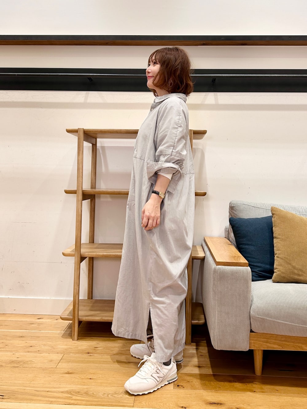程よくハリのある生地で、体のラインを拾いにくいシャツワンピース。
