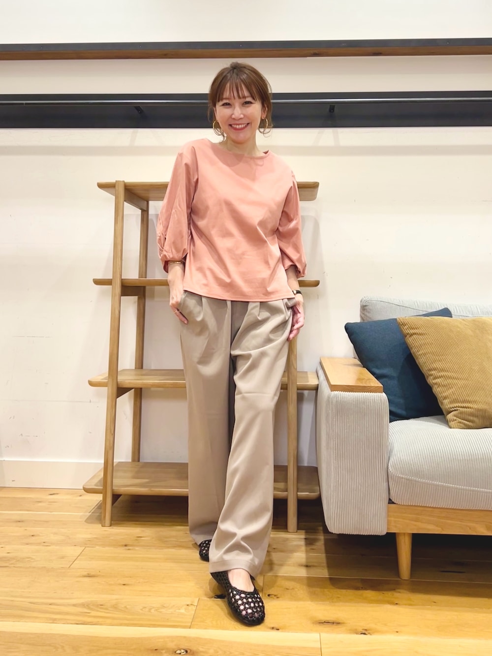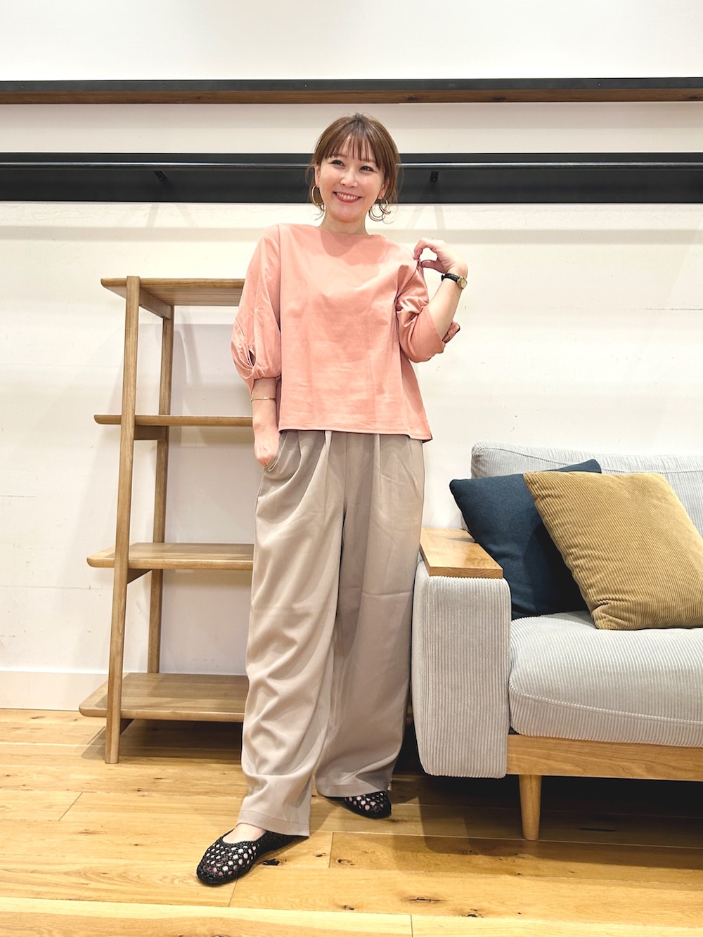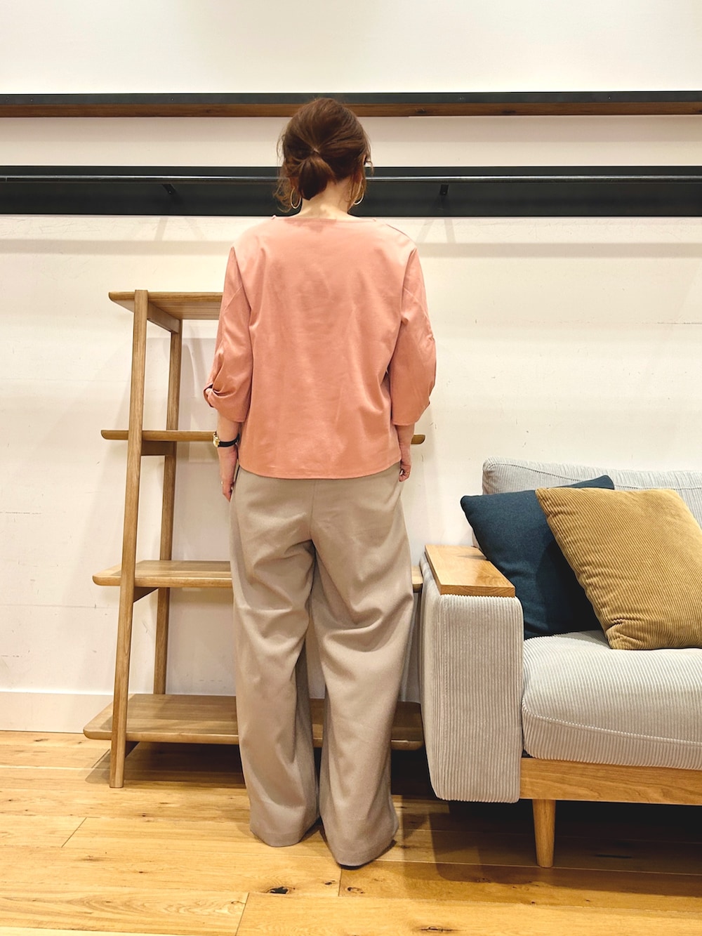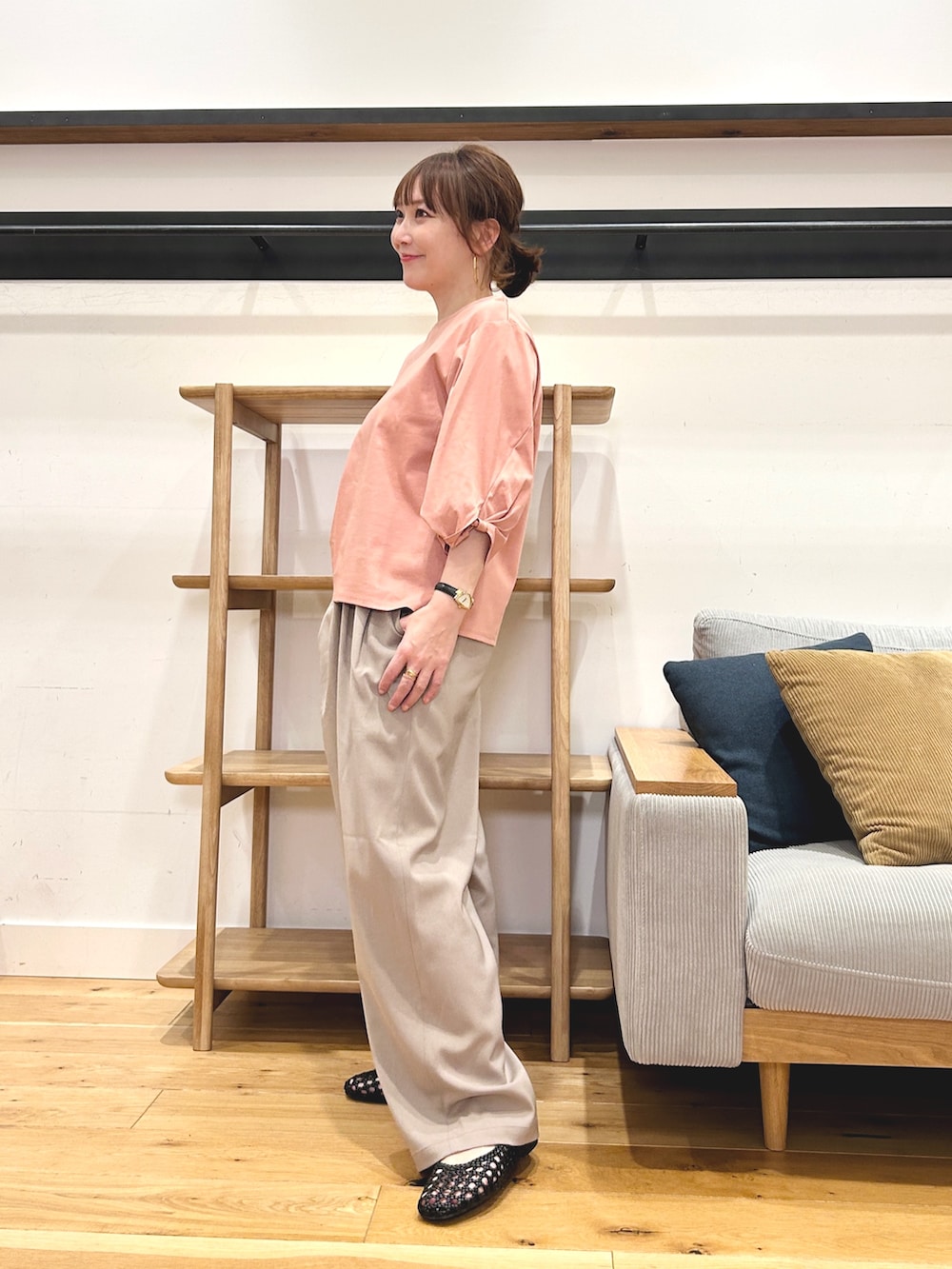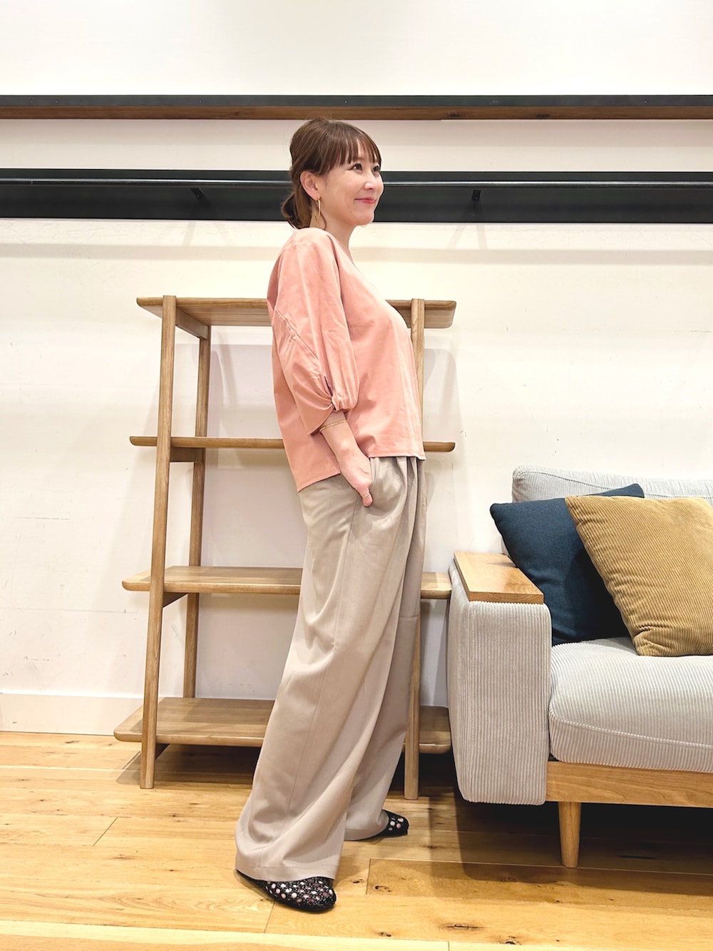 タックとギャザーが入った立体感のあるシルエットで、楽な穿き心地ながら上品に見えます。