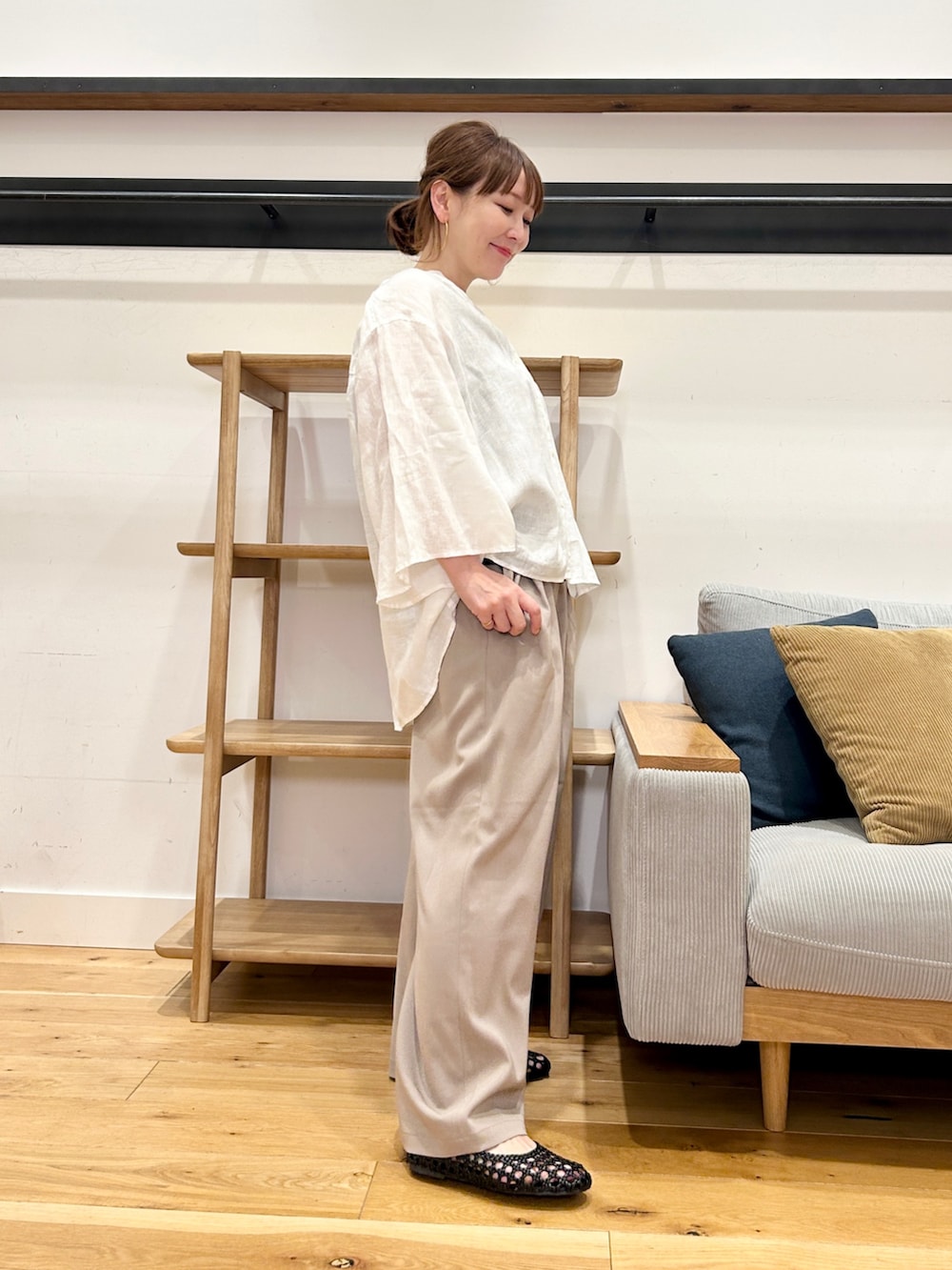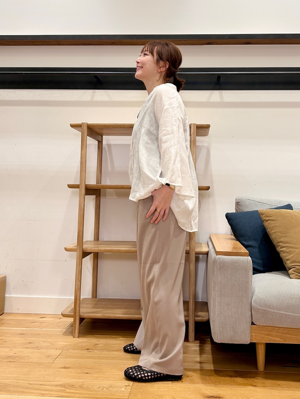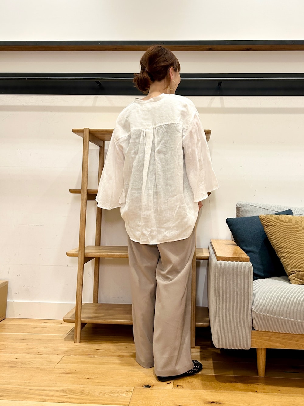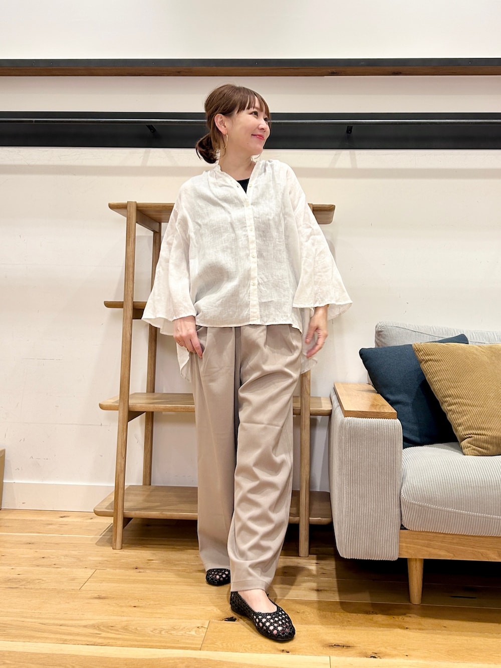 フレアスリーブが動くたびにふんわり広がり、シンプルながらも一枚で雰囲気が出ます。