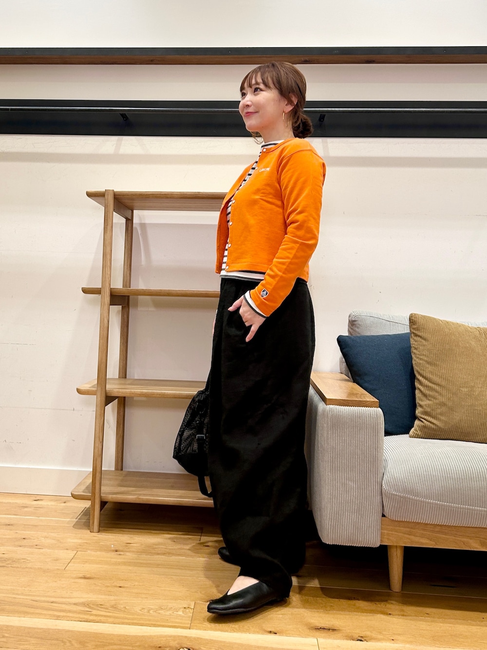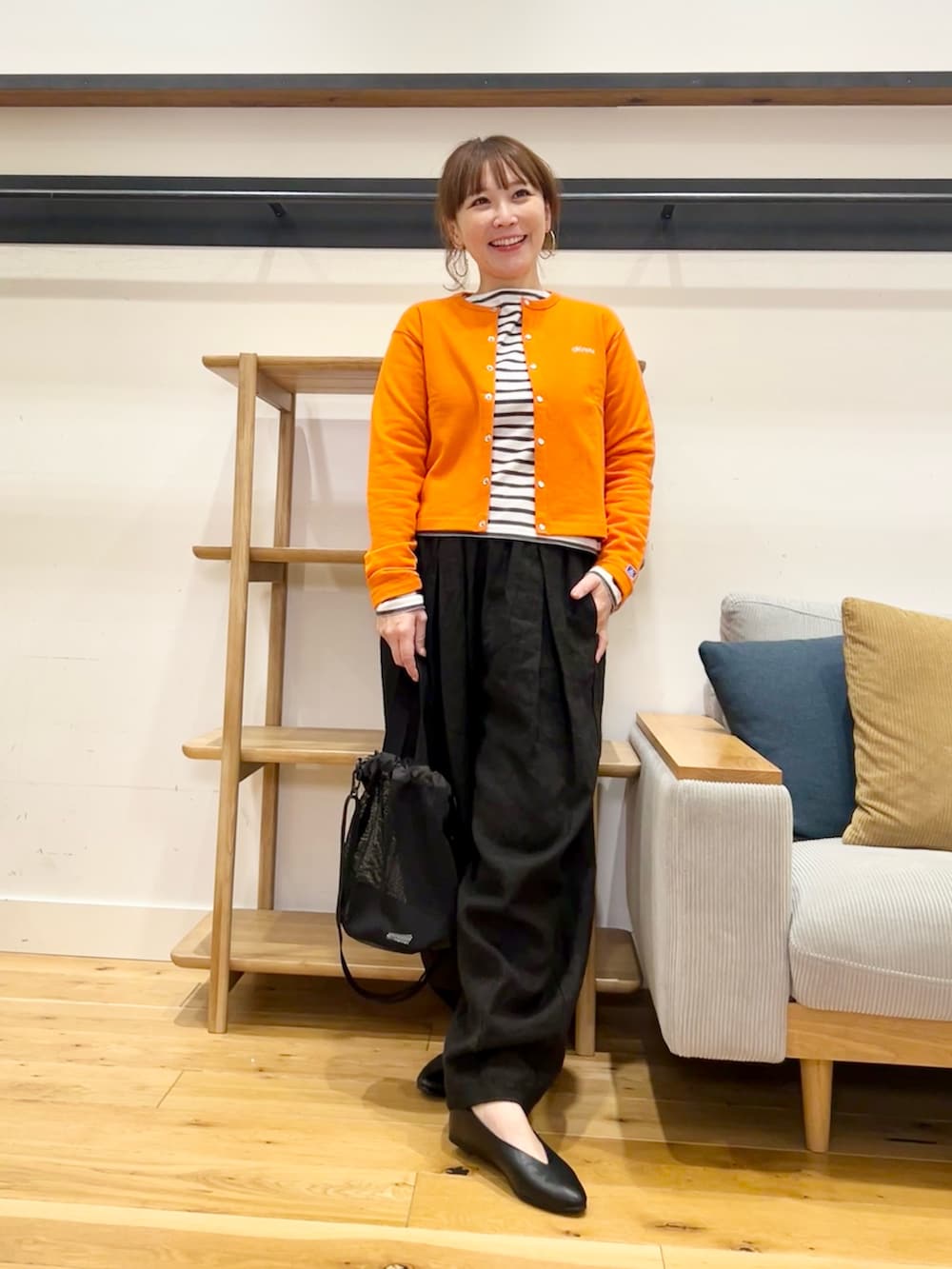パッと目を引くオレンジが主役になるカーディガン。