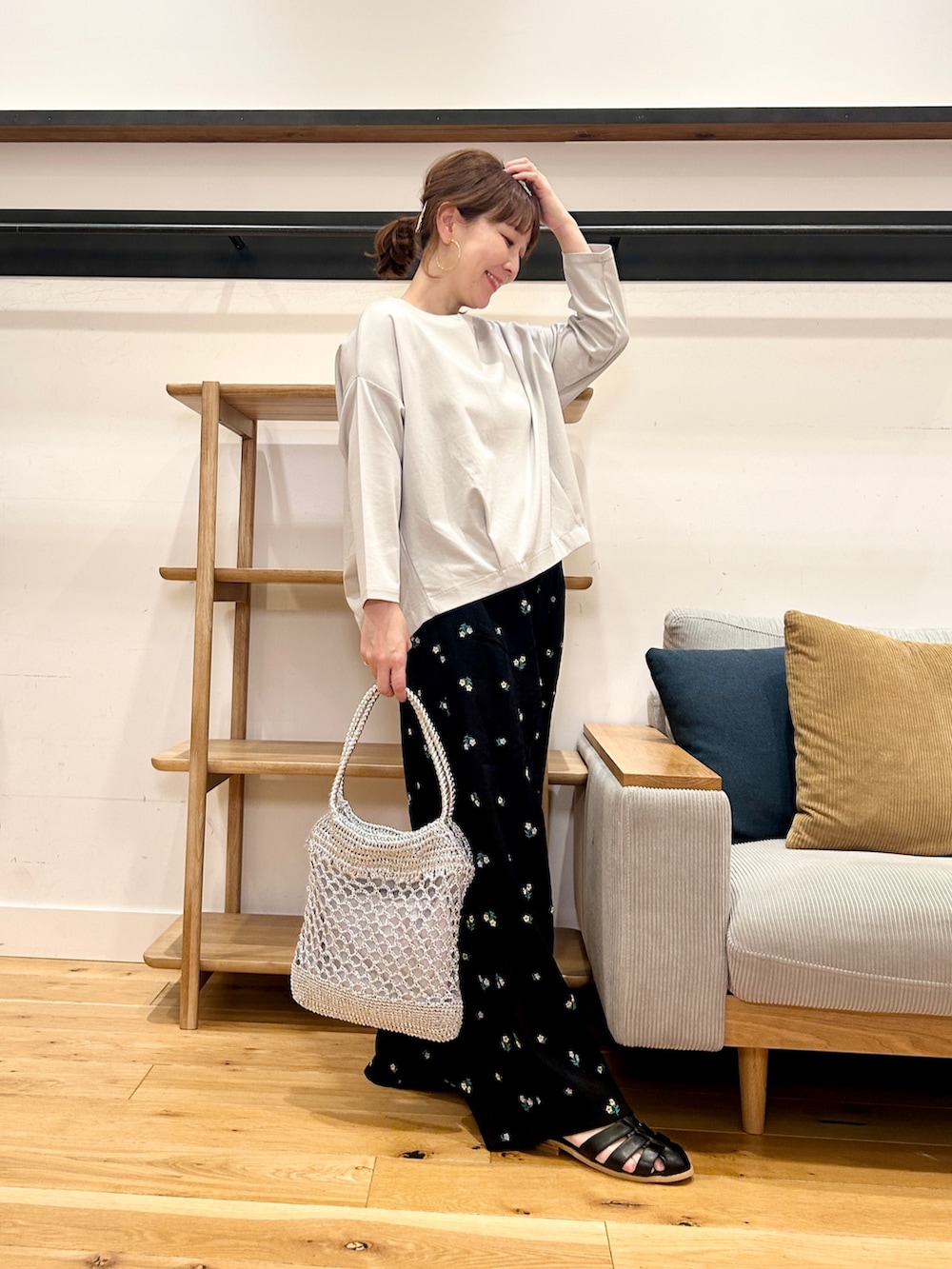 ツルッとした生地で、カジュアルにもきれい目にも、パンツにもスカートにも、かなり使いやすいトップスです。