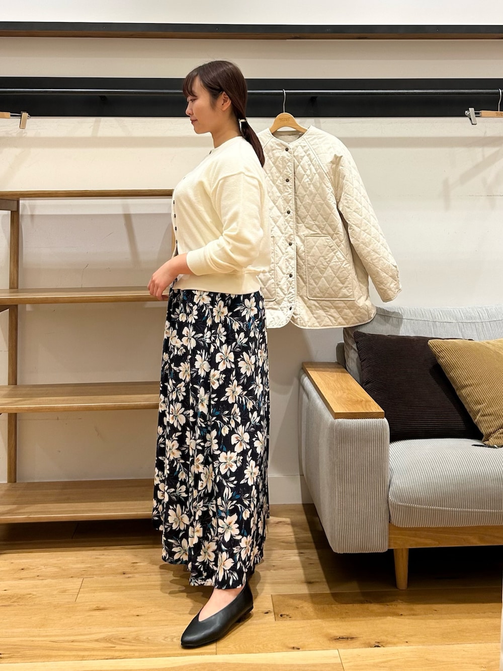 カットブークレーショートカーディガンは、しなやかで柔らかい生地感が着心地良いアイテムです。オフホワイトは清潔感ある印象をコーデにプラスできるので、キレイめアイテムとの相性も良いです👍