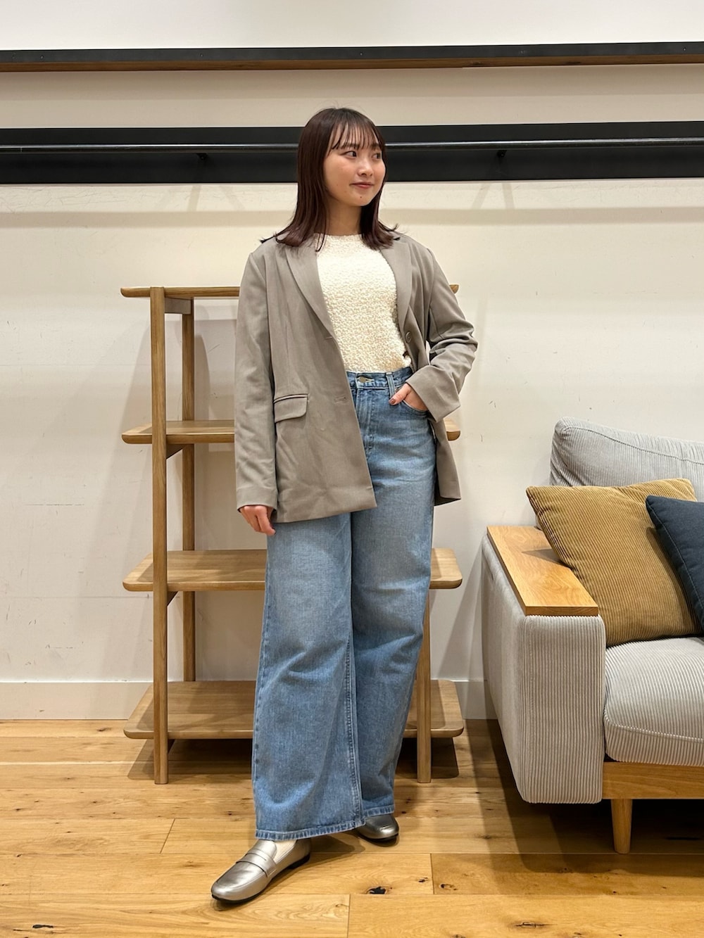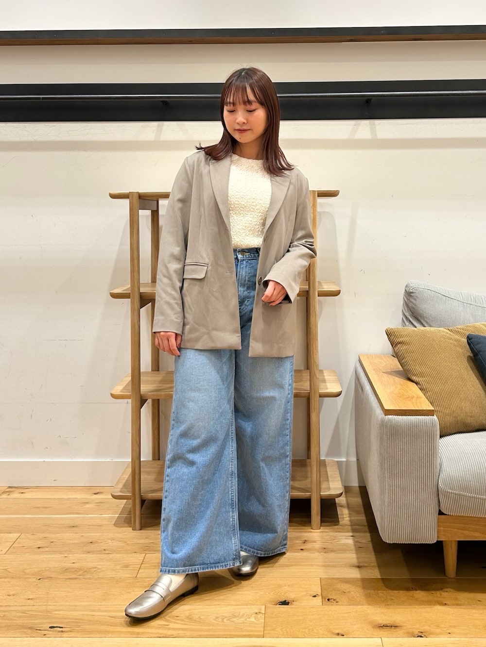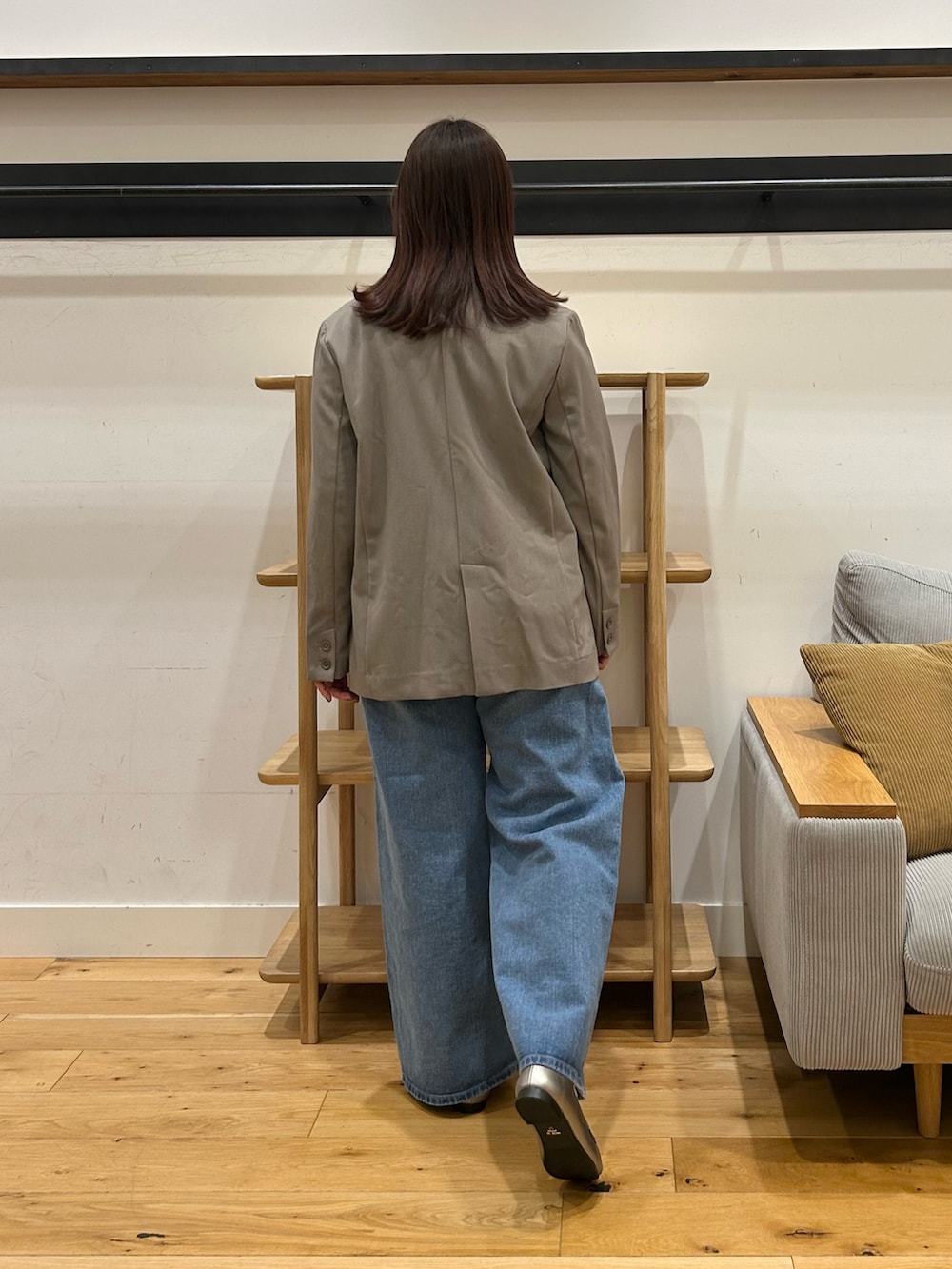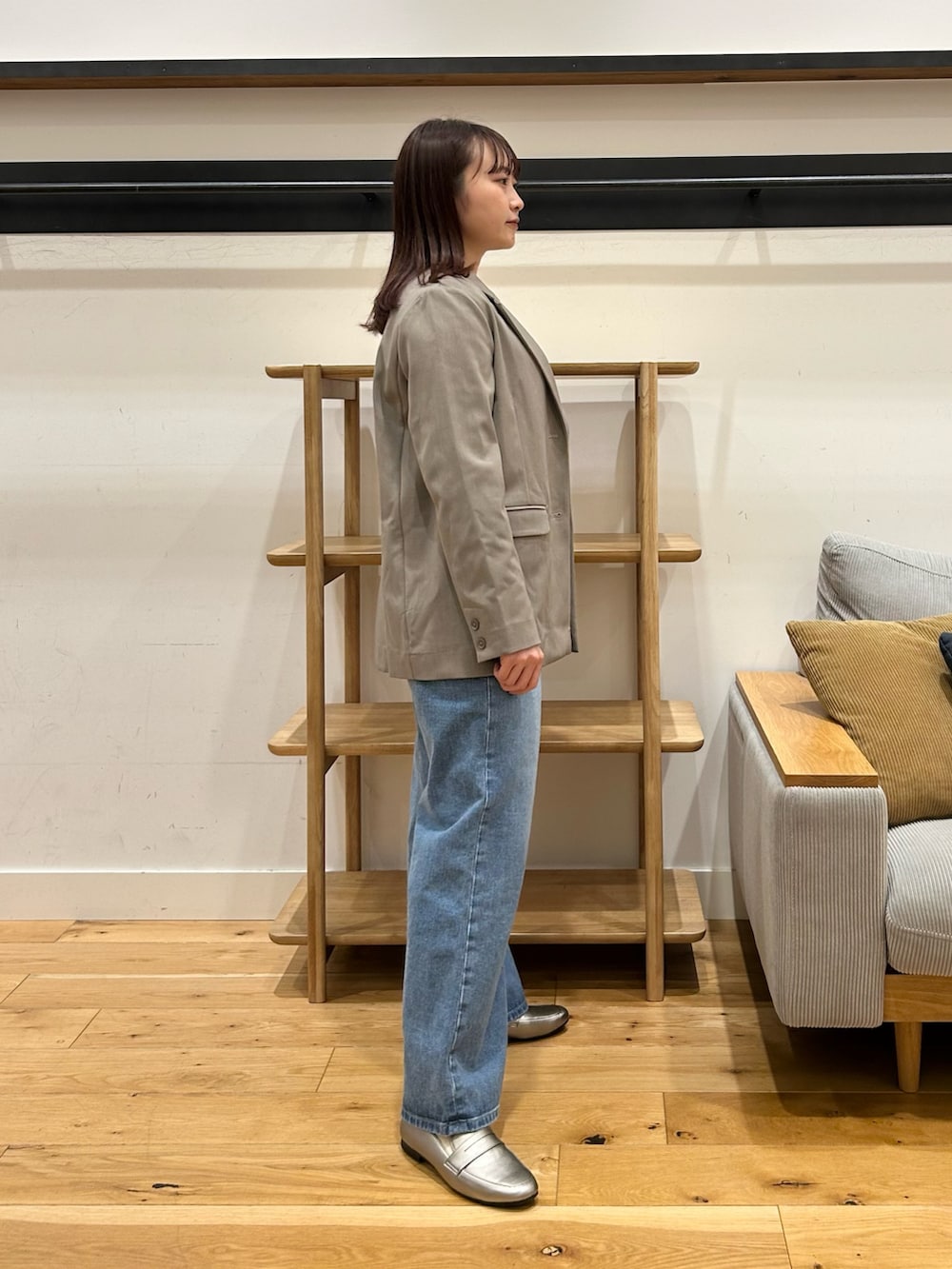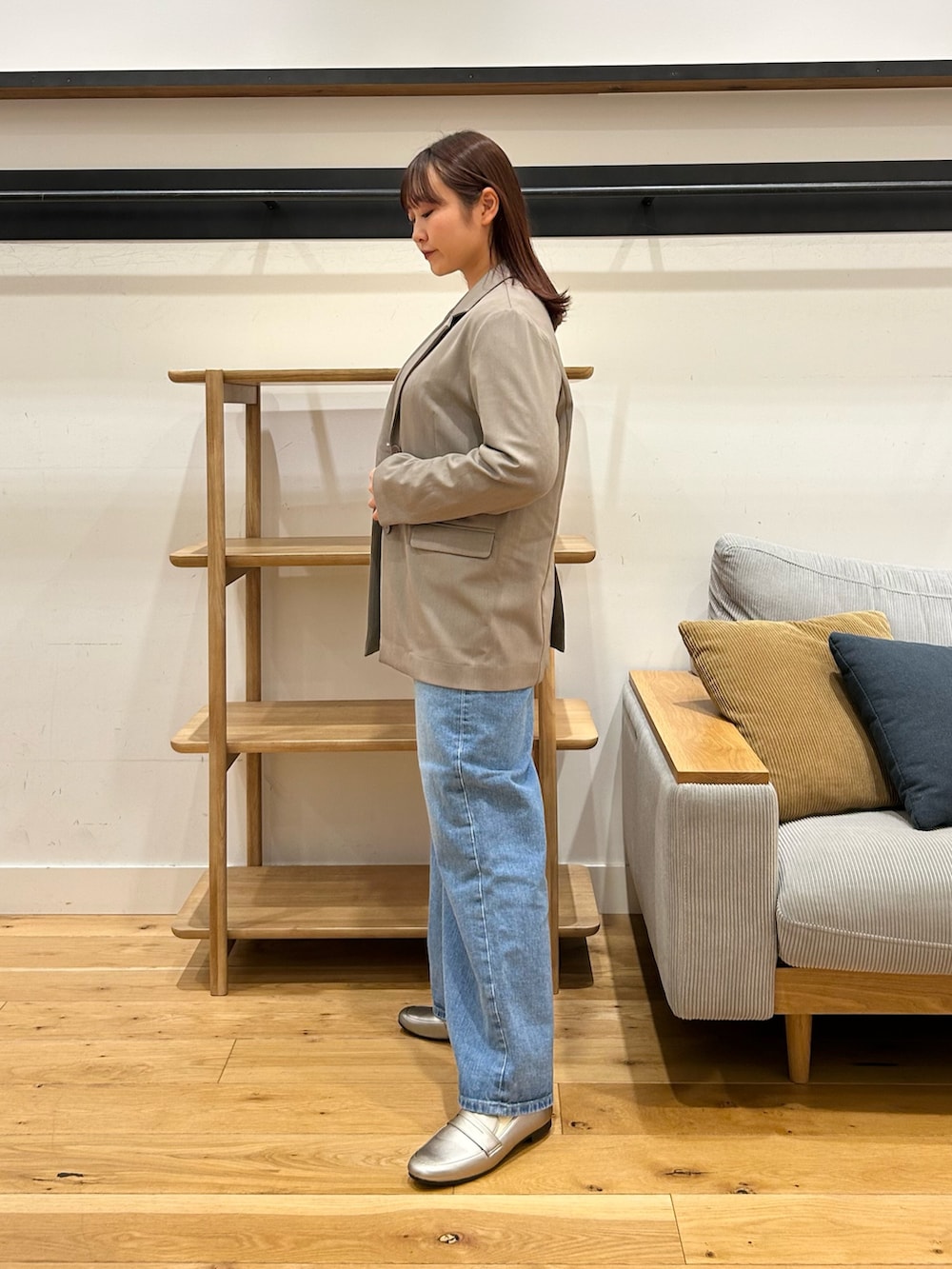 完声テーラードジャケットは、低身長でフリーサイズを着用してもオーバーサイズ感が出にくいスマートさが魅力のアイテムです。落ち感良い生地のおかげで、キチンと感持たせつつカジュアル服とも合わせられるラフさがあってかなり良いです👏グレージュは特にオンオフ問わず使えるお色味なので、カジュアル派さんにもオススメです✨