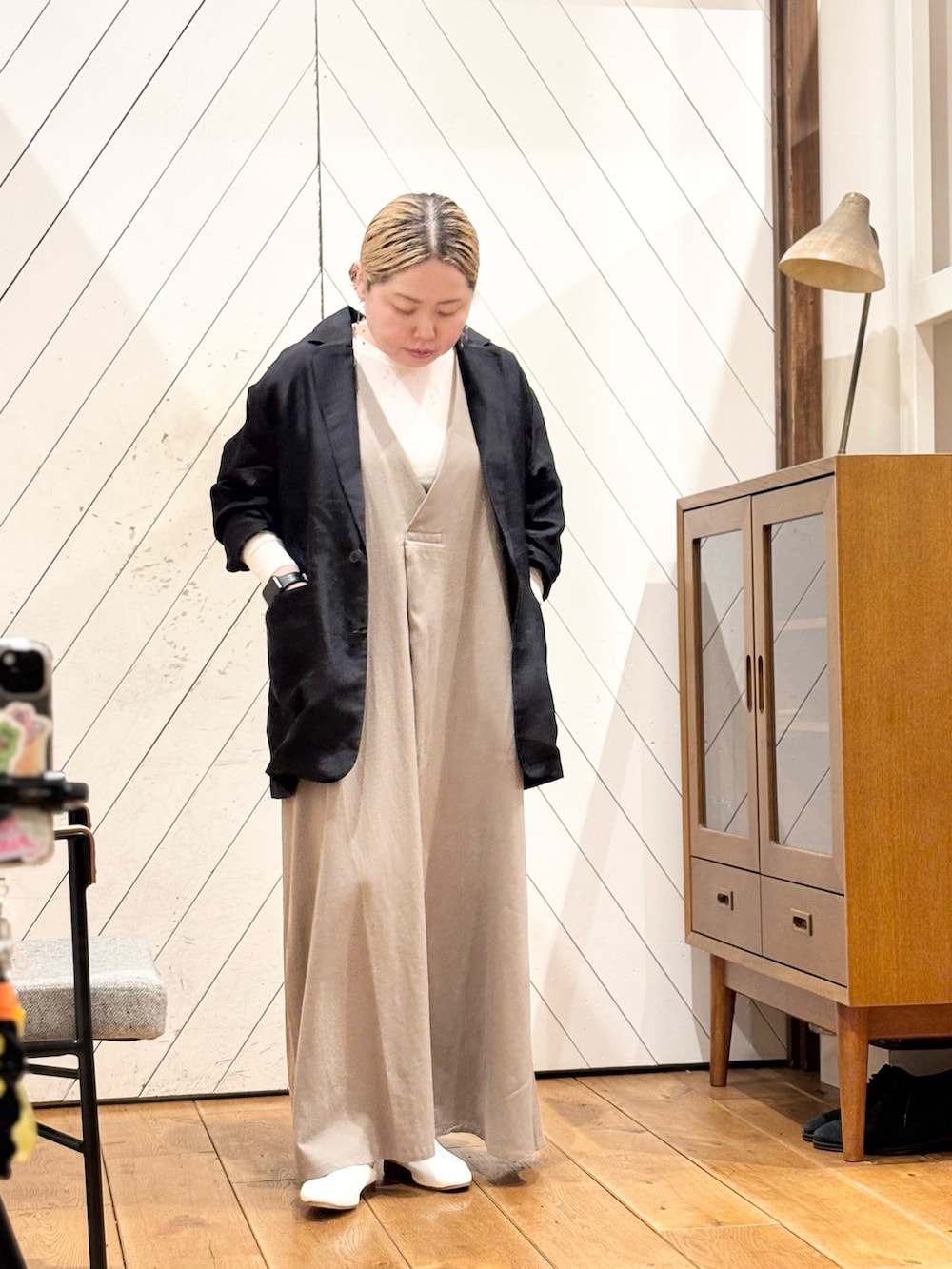 ワンピースはVネックで前にタックの入った