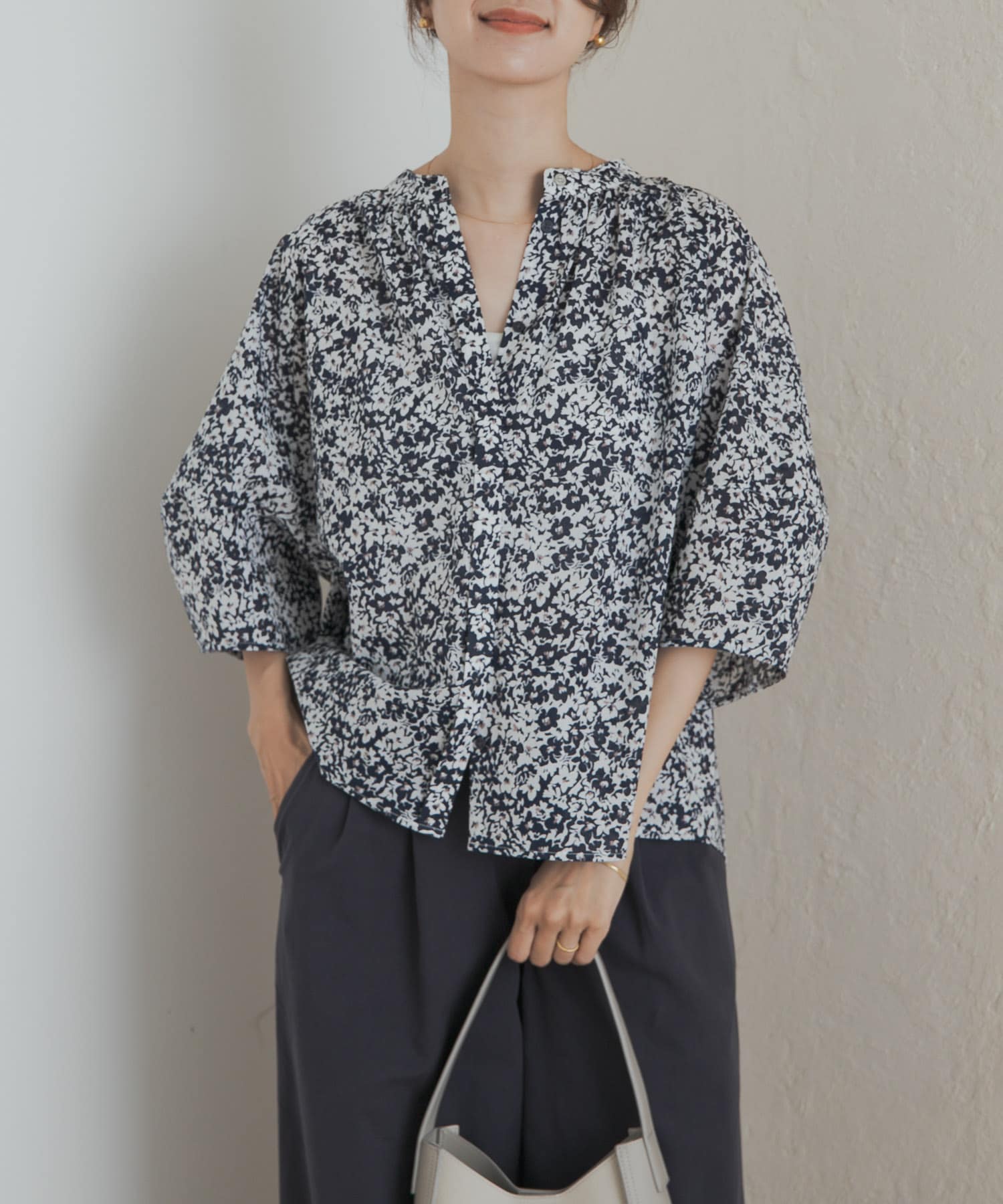 ドルマンシルエットとフラワープリントが華やかなブラウスです